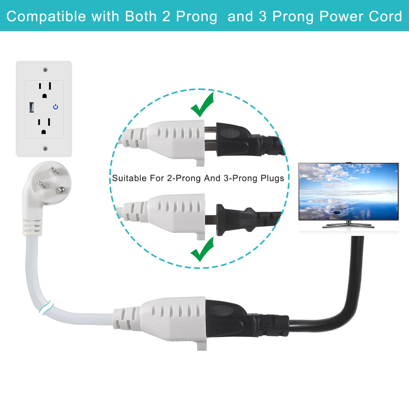 Q: What appliances are compatible with this extension cord?A: This extension cord is compatible with both 3 prong grounded cords and 2 prong electrical cords. It can be used with various household appliances, including toasters, microwaves, espresso machines, wall-mounted TVs, and more.