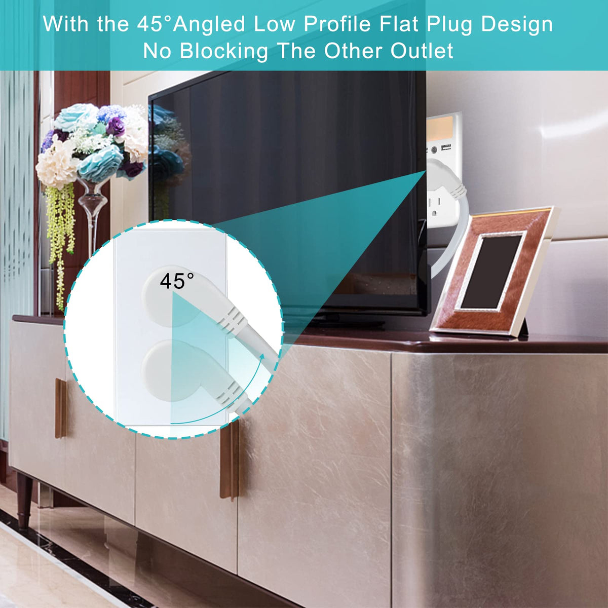 Q: Can I use this extension cord for appliances behind furniture?A: Yes, the low profile flat plug design of this extension cord is ideal for tight spaces, allowing you to place furniture closer to the wall without blocking outlets. This makes it perfect for use behind sofas, TVs, bookshelves, and cabinets.