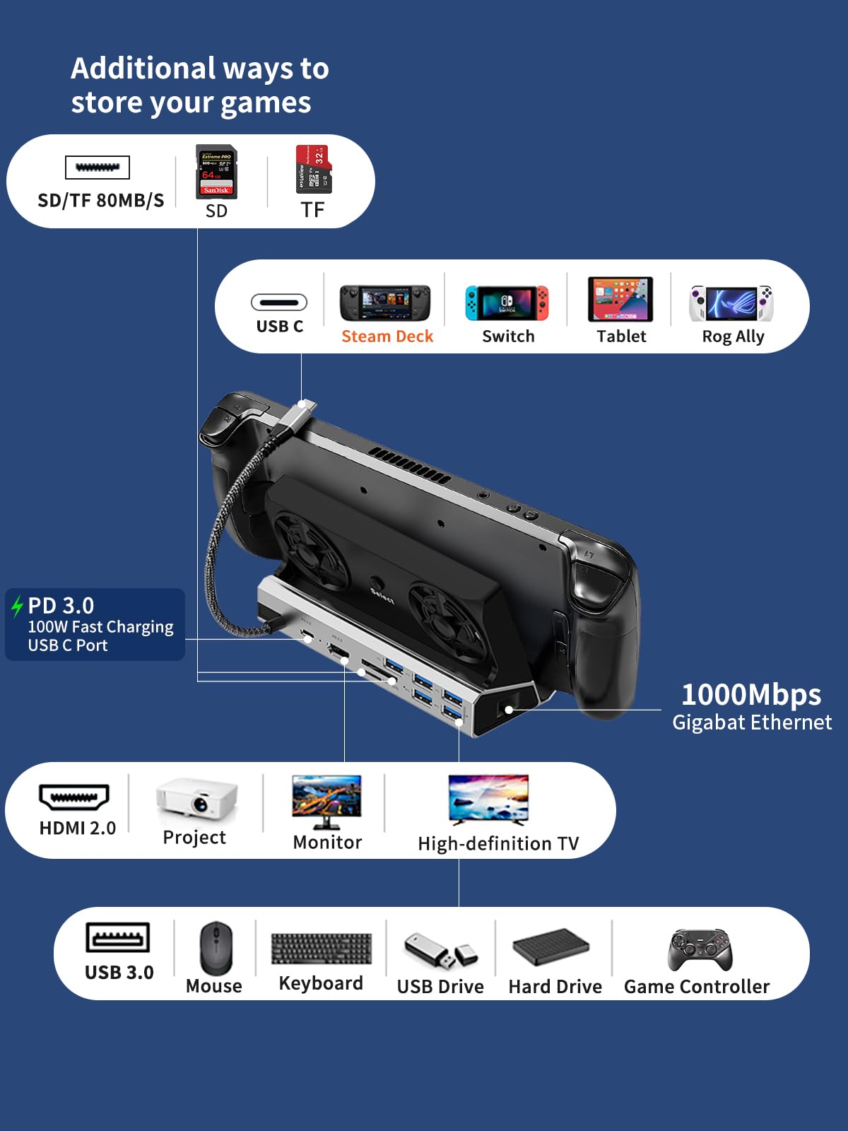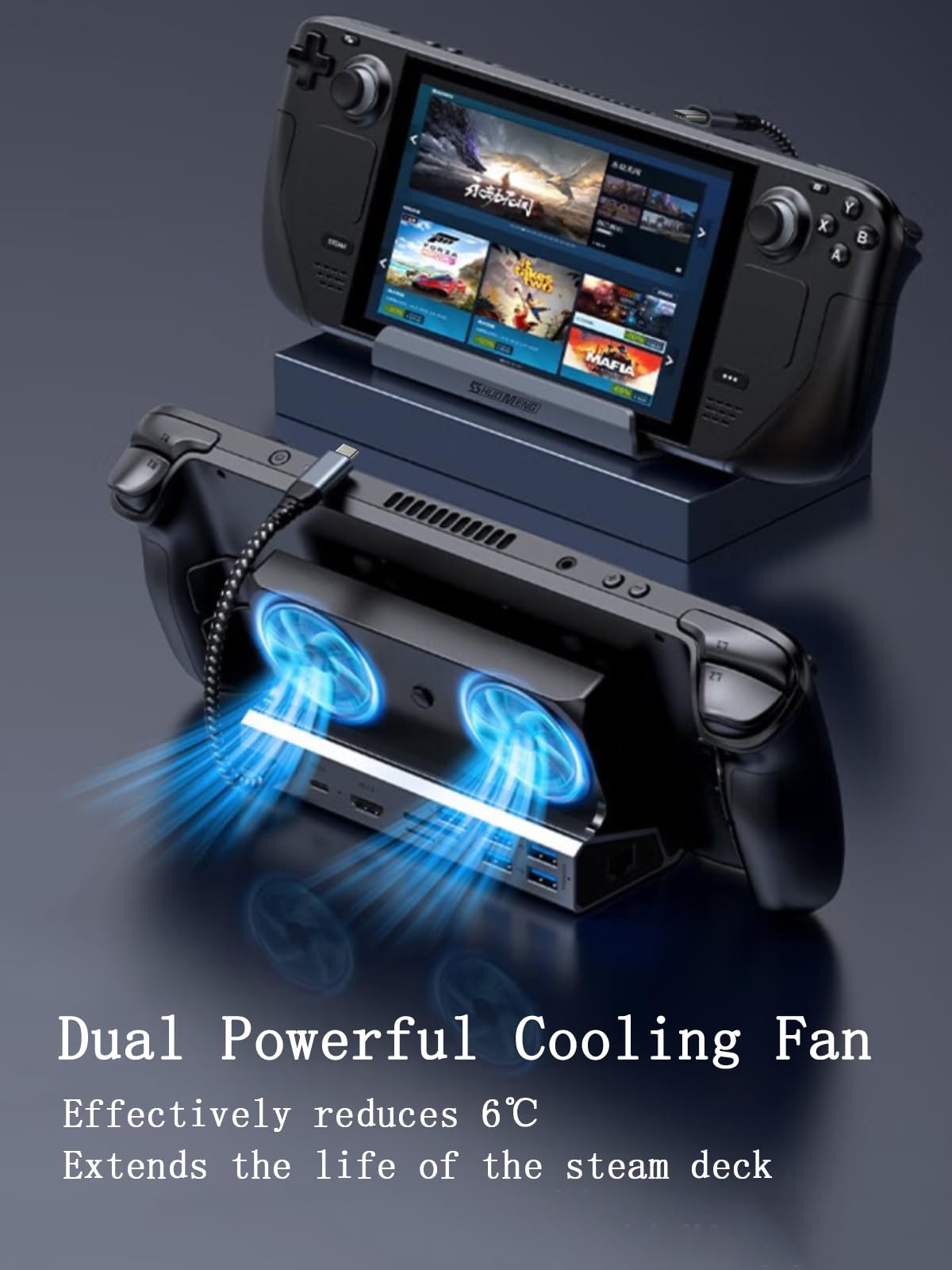 Shuomeng Steam Deck/Rog Ally/Switch/Legion Go Dock, 4K60Hz Steam Deck Oled Docking Station Dual Fan,10 In 1 Stream Deck Dock, Hd