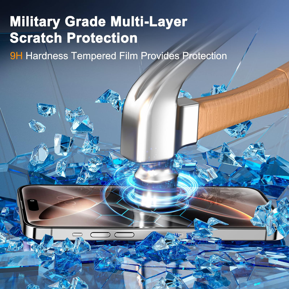 Screen Protection Compatibility: We Offer 3 Pcs Tempered Glass Screen Protector With Camera Protector, Carefully Designed For Iphone 16 Pro Max 6.9 Inch, Incompatible With Any Other Iphone Models, Ensure Perfect Fit, Please Check Your Model Before Purchase | Anti-Scratch, Anti-Fingerprint, High Sensitivity: 9H Hardness Iphone 16 Pro Max Screen Protector Is Specially Tempered To Strengthen The Surface Of The Screen Protector To Withstand External Scratches And Impacts More Effectively And Reduce Screen Damage, Rounded Edges Are Integrated To Maintain The Original Response Sensitivity To Keep Typing Fast And Accurate And Gaming Videos Smooth | High Transparency And Clarity: The Thickness Of The Screen Protector For Iphone 16Pro Max Only 0.33Mm, And The Surface Is Uniquely Treated With A Light Transmittance Rate Of Over 99.99% Optical-Grade Transparency, Enhancing The Visibility Of The Screen And Maintaining The Original Hd Transparent Viewing Experience, Which Is More Intuitive And Clear | Night Ring Shooting Lens Film: Camera Lens Protector Made Of 9H Hardness + Tempered Glass, Which Protects The Entire Lens From Drops, Impact Scratches And Peeling Off. Upgraded Black Night Circle Design Applies During Night Shooting Without Interfering With The Flash, Capturing Every Detail Clearly Thus Guaranteeing The Original Picture Quality Of Photo And Video Quality | Easy Instaallation: The Screen Protector Comes With Separate Precision Cleaning Kit That Allows You To Easily Install Apps And Remove It Without Residue And Without Worrying About Air Bubbles. Whether You Are Playing With Your Kids Or Outdoors, You Can Enjoy Your Time Without Worrying About Your Iphone Being Broken