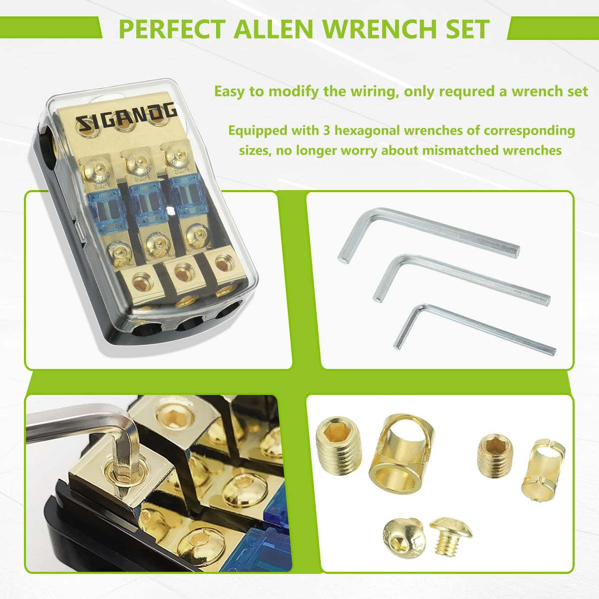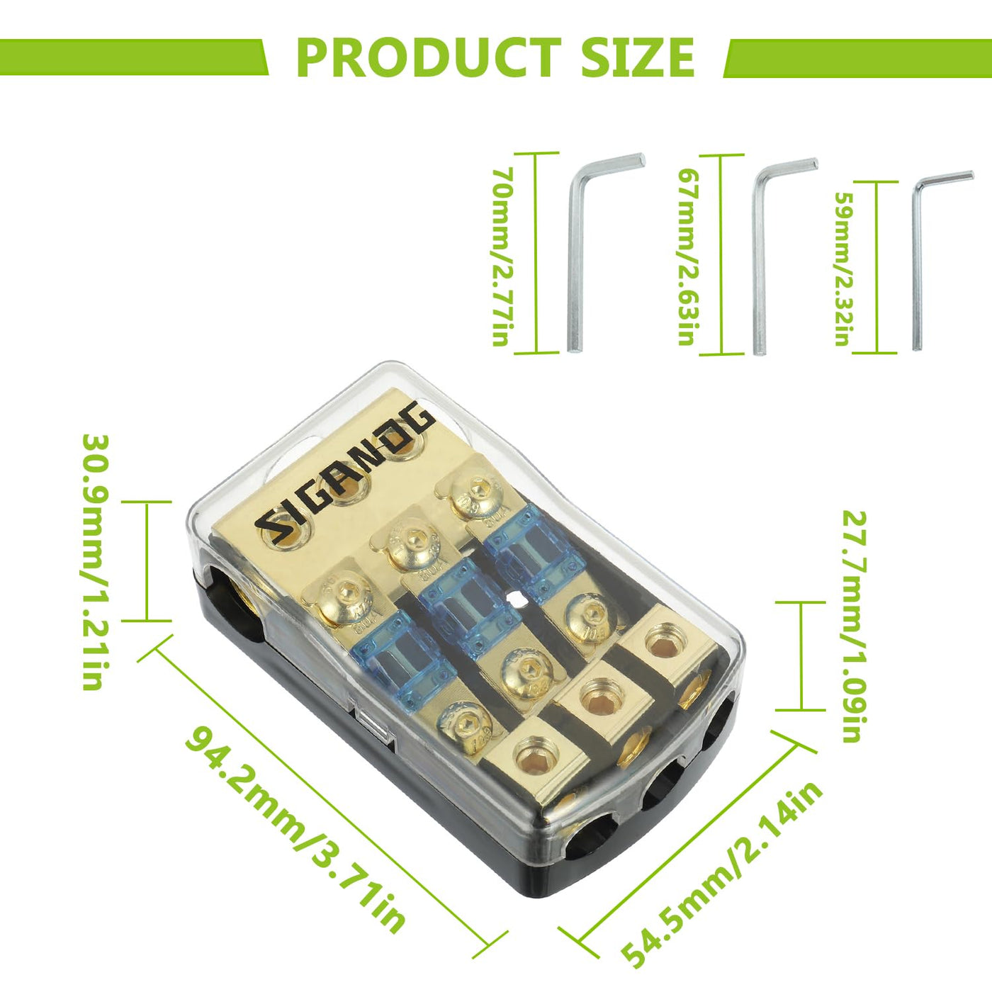 Sigandg 3 Way 60A 12V Anl Fuse Holder Product Information Material: Copper Condition: 100% Brand New Item Type: Fuse Distribution Block Voltage: 12 Volts Current Rating 60 Amp Size: 0/4 Gauge In To 4/8 Gauge Out Advantage 1.Made Of Highly Plastic And Copper Materials,Nickel-Plated Contacts Are Not Easily Faded.Strong Conductivity, High Temperature Resistance, The Shell Is Not Fragile. 2.Beneficial For Protecting The Car Audio And The Circuit To A Certain Extent. Application Mainly Used For Auto, Boat Or Other Vehicles, Protect Your Audio System. Package Included 1 X 3 Way 60A 12 V Mini-Anl Fuse Holder 3X Hexagon Wrench