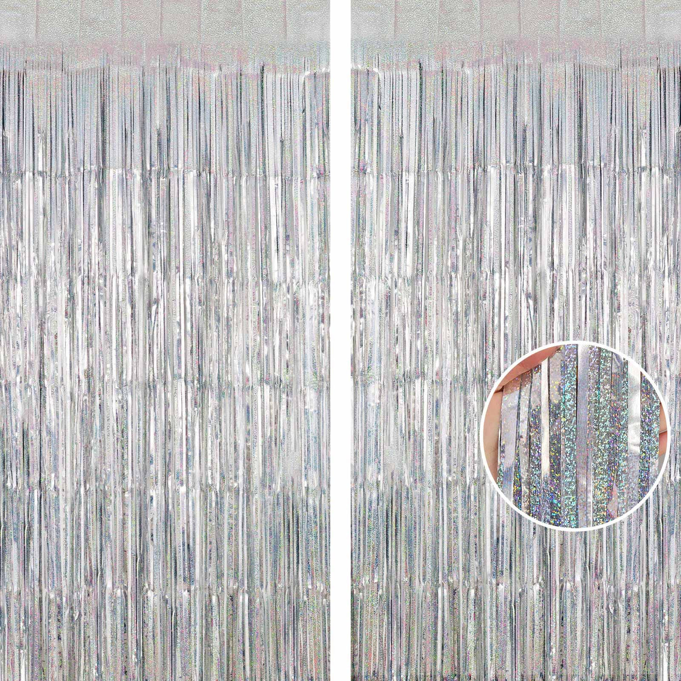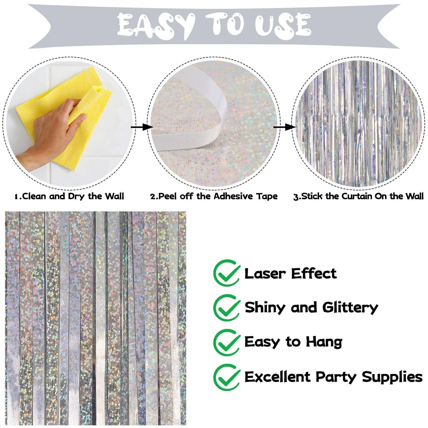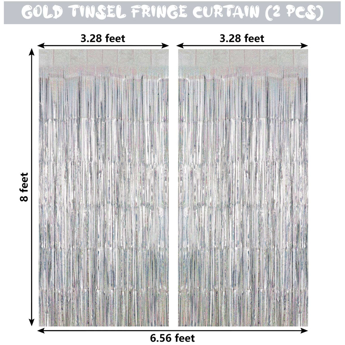 Our Tinsel Fringe Curtains Have Classy Appearance, Glittering Gloss, And Large Size. The Laser Effect Of The Metallic Tinsel Curtain Backdrops Can Make Your Party More Shiny And Splendid. Want To Have A Glamorous And Unforgettable Party? Choose Our Tinsel Foil Fringe Curtains! Package Includes: 2 Pcs Fringe Curtain Size: 6.56X8 Ft/ 2X2.45 M Color: Silver Material: Foil