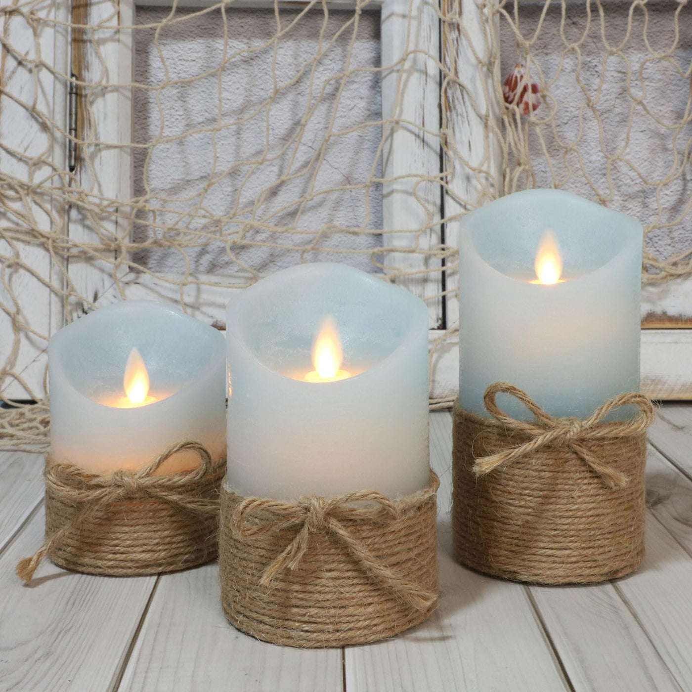 Hemp Rope Ocean Blue Candle Design The Hemp Rope Is Wrapped In Ocean Blue Candles, Which Is A Combination Of The Farmhouse And Marine Themes. &Nbsp; Specification: Material: Paraffin Wax, Hemp Rope Light Source: Flicker Wick Light Color: Warm White Switch: On-Off Remote: 10-Key&Nbsp;Interval Battery: 2 Aa Battery(Not Included) Battery Power Time: 200+ Hours Package: 3 X Led Candles, 1 X 10-Key Remote Control, 1 X User Manual &Nbsp; Safe And Practical: No Risk Of Fire And Smoke At All, Won'T Cause Any Fire Hazard To Your Home, Suit For Holiday, Party&Nbsp;Event. &Nbsp; Warm&Nbsp;Tips: 1.This Is A Flameless Candle, It? Made Of Real Wax.Do Not Attempt To Fire&Nbsp;This Candle. 2. Real Wax Candle.Please Keep Away From Heat Sources,Extreme Temperatures &Nbsp;And Out Of Direct Sunlight, &Nbsp;That Will Make Your Candle Soften Or Melt. 3. Constant Use Of The Timer However May Considerably Reduce Battery Life. If You Not Using Candle Lights For A Long Time, Please Switch The Led Candle Off At The Bottom To Save Battery