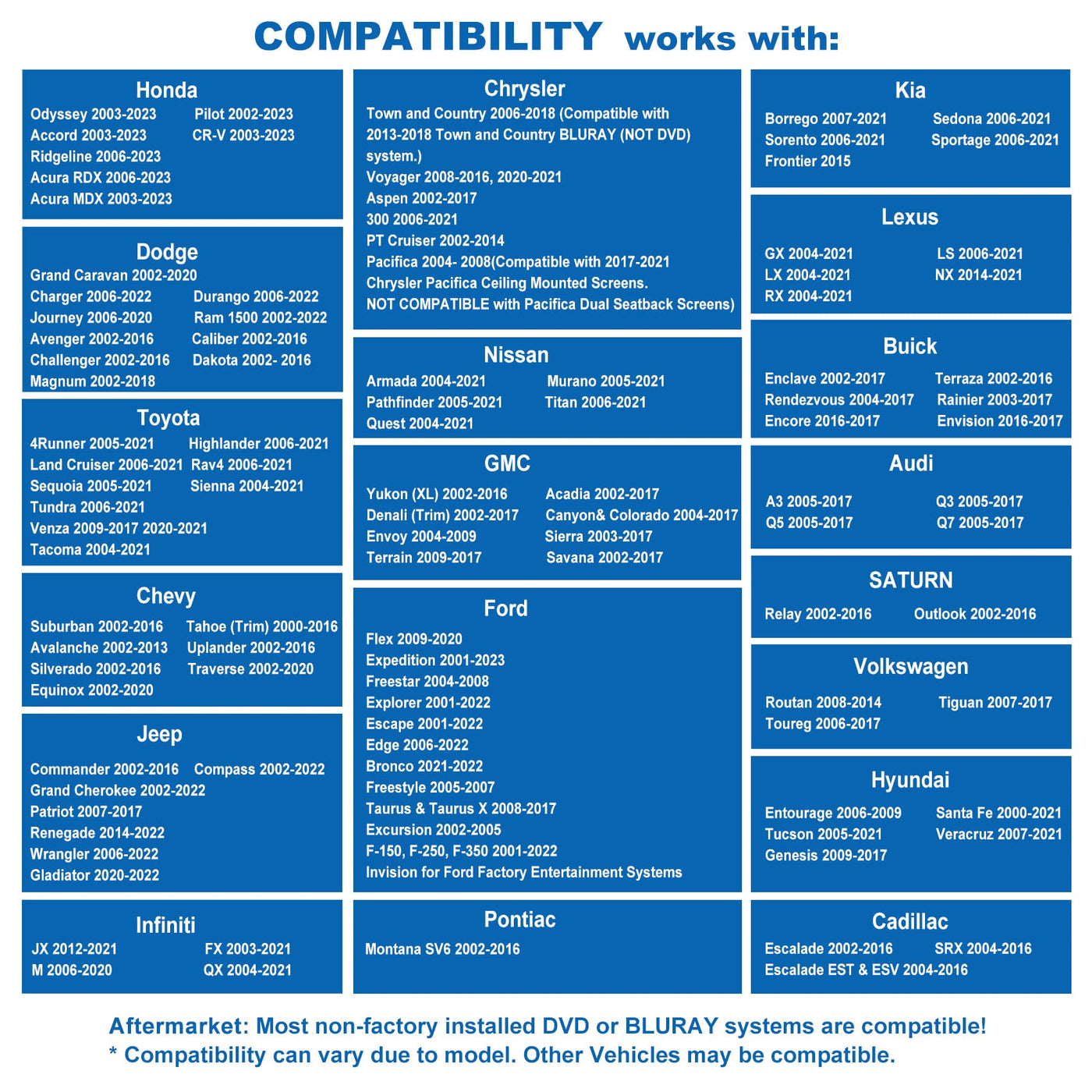 Simolio Ir Car Dvd Headphones Are Compatible: Honda Odyssey 2003 2004 2005 2006 2007 2008 2009 2010 2011 2012 2013 2014 2015 2016 2017 2018 2019 2020 2021 2022 2023 Honda Pilot 2002 2003 2004 2005 2006 2007 2008 2009 2010 2011 2012 2013 2014 2015 2016 2017 2018 2019 2020 2021 2022 2023 Honda Accord 2003 2004 2005 2006 2007 2008 2009 2010 2011 2012 2013 2014 2015 2016 2017 2018 2019 2020 2021 2022 2023 Honda Cr-V 2003 2004 2005 2006 2007 2008 2009 2010 2011 2012 2013 2014 2015 2016 2017 2018 2019 2020 2021 2022 2023 Honda Ridgeline 2006 2007 2008 2009 2010 2011 2012 2013 2014 2015 2016 2017 2018 2019 2020 2021 2022 2023 Honda Acura Rdx 2006 2007 2008 2009 2010 2011 2012 2013 2014 2015 2016 2017 2018 2019 2020 2021 2022 2023 Honda Acura Mdx 2003 2004 2005 2006 2007 2008 2009 2010 2011 2012 2013 2014 2015 2016 2017 2018 2019 2020 2021 2022 2023 Chevy Suburban 2002 2003 2004 2005 2006 2007 2008 2009 2010 2011 2012 2013 2014 2015 2016 Chevy Tahoe (Trim) 2000 2001 2002 2003 2004 2005 2006 2007 2008 2009 2010 2011 2012 2013 2014 2015 2016 Chevy Avalanche 2002 2003 2004 2005 2006 2007 2008 2009 2010 2011 2012 2013 Chevy Uplander 2002 2003 2004 2005 2006 2007 2008 2009 2010 2011 2012 2013 2014 2015 2016 Chevy Silverado 2002 2003 2004 2005 2006 2007 2008 2009 2010 2011 2012 2013 2014 2015 2016 Checy Traverse 2002 2003 2004 2005 2006 2007 2008 2009 2010 2011 2012 2013 2014 2015 2016 2017 2018 2019 2020 Chevy Equinox 2002 2003 2004 2005 2006 2007 2008 2009 2010 2011 2012 2013 2014 2015 2016 2017 2018 2019 2020 Gmc Yukon (Xl) 2002 2003 2004 2005 2006 2007 2008 2009 2010 2011 2012 2013 2014 2015 2016 Gmc Acadia 2002 2003 2004 2005 2006 2007 2008 2009 2010 2011 2012 2013 2014 2015 2016 2017 Gmc Denali (Trim) 2002 2003 2004 2005 2006 2007 2008 2009 2010 2011 2012 2013 2014 2015 2016 2017 Gmc Canyon & Colorado 2004 2005 2006 2007 2008 2009 2010 2011 2012 2013 2014 2015 2016 2017 Gmc Envoy 2004 2005 2006 2007 2008 2009 Gmc Sierra 2003 2004 2005 2006 2007 2008 2009 2010 2011 2012 2013 2014 2015 2016 2017 Gmc Terrain 2009 2010 2011 2012 2013 2014 2015 2016 2017