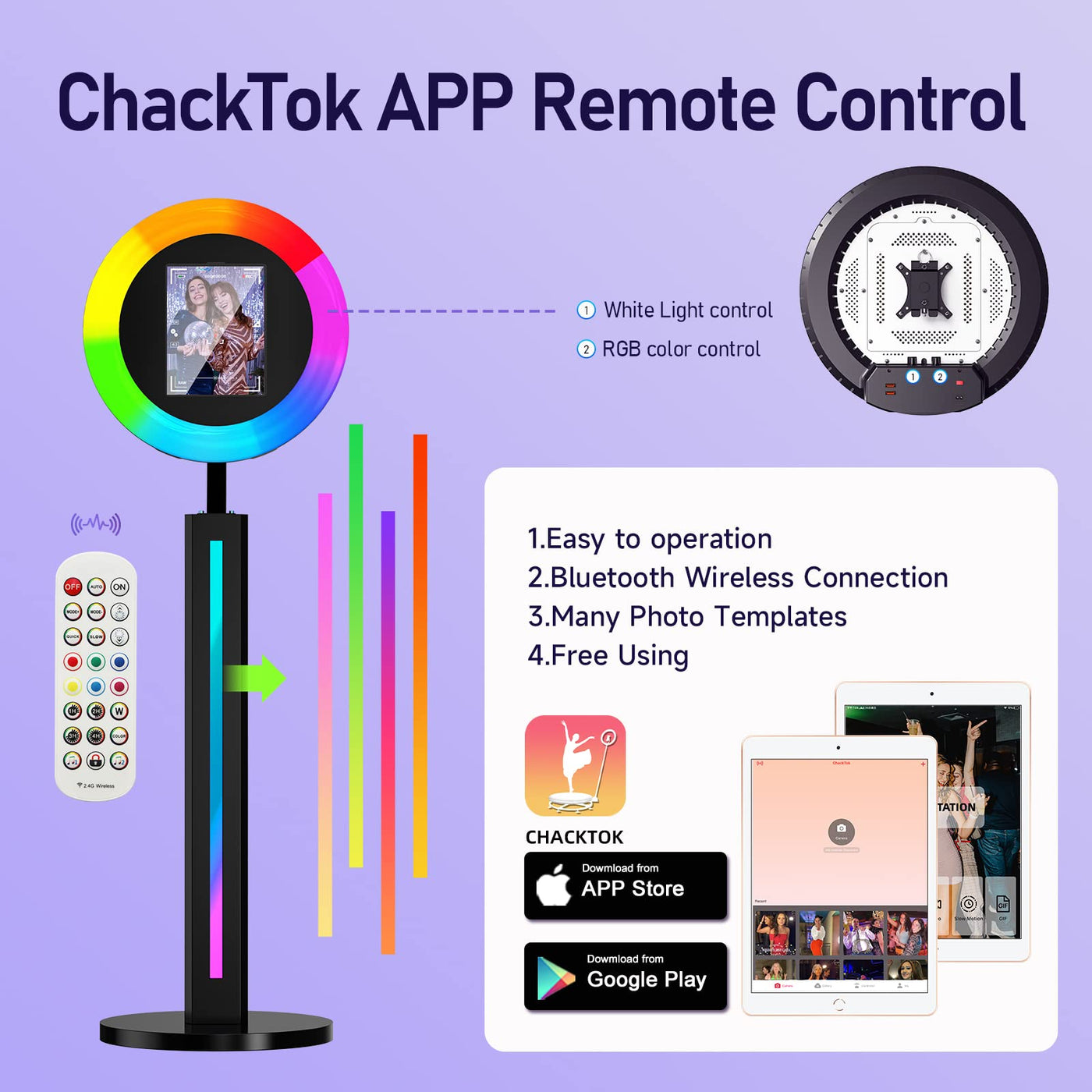 Q: How does the RGB ring light work with the photo booth?A: The RGB ring light features over 20 color modes and adjustable brightness from 1% to 100%. It can be controlled via a button or the CHACKTOK app, allowing you to synchronize the lighting effects with music, enhancing your photography experience.