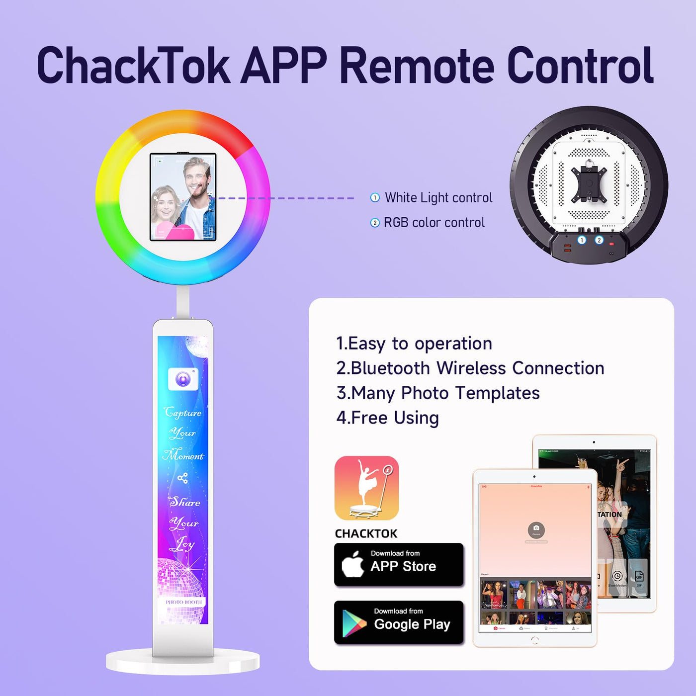 Q: How does the RGB ring light work on the photo booth?A: The RGB ring light features over 20 color modes and adjustable brightness levels ranging from 1% to 100%. It can be controlled via a button or through the CHACKTOK app, and it can synchronize with music, providing a dynamic lighting experience for your photos and videos.
