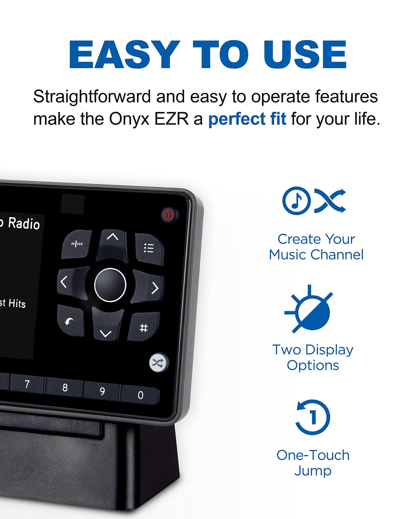 The Sxezr1H1 Onyx Ezr With Home Kit Allows You To Enjoy Siriusxm In Your Home Or On Your Powered Audio Speakers Use Split-Screen Mode On The Easy-To-Read High-Res Screen To See What Other Channels Are Playing Choose From Two Display Options (White Text On Black Background Or Black Text On White Background) And View Artist Or Show Name, Song Or Program Title, And Content Or Channel Information You Can Easily Lock And Unlock Channels With Mature Content With The Parental Controls Store Up To 10 Of Your Favorite Siriusxm Channels Or Create Your Own Music Channel From Selected Channels With Tunemix Hear Exclusive Entertainment Only Available On Siriusxm Like Howard Stern, Today Show Radio, Fox News, Cnn And Kids Bop Radio Plus Live Play-By-Play Sports From The Nfl, Mlb, Nba, Nhl, The Best Games In College Sports And Nascar Races Hear Dedicated Ad-Free Music Channels From Your Favorite Artists Like The Beatles Channel, U2 X-Radio, Eminemas Shade 45, Kenny Chesneyas No Shoes Radio, Pitbullas Globalization, Bruce Springsteen E Street Radio, Pearl Jam Radio, Dave Matthews Band Radio And Jimmy Buffetas Margaritaville Receive 3 Months Free Service When You Subscribe To The Aall Accessa Package If Calling To Activate Your Radio, Provide Your Radio Id And Mention Anever Miss A Beata A 15 Dollar Activation Fee And Credit Card Are Required For This Offer Siriusxm Is Where Moments Happen Like The Moment You Hear Your Song Or You Laugh Or Your Team Takes The Lead These Moments Matter, And Youall Find Them Here, 247 In Ad-Free Music, Plus Talk, Sports, Comedy, And News Live And On Demand And Theyare On In Your Car, Online Or On The App So You Wonat Miss A Thing Subscription Sold Separately By Siriusxm