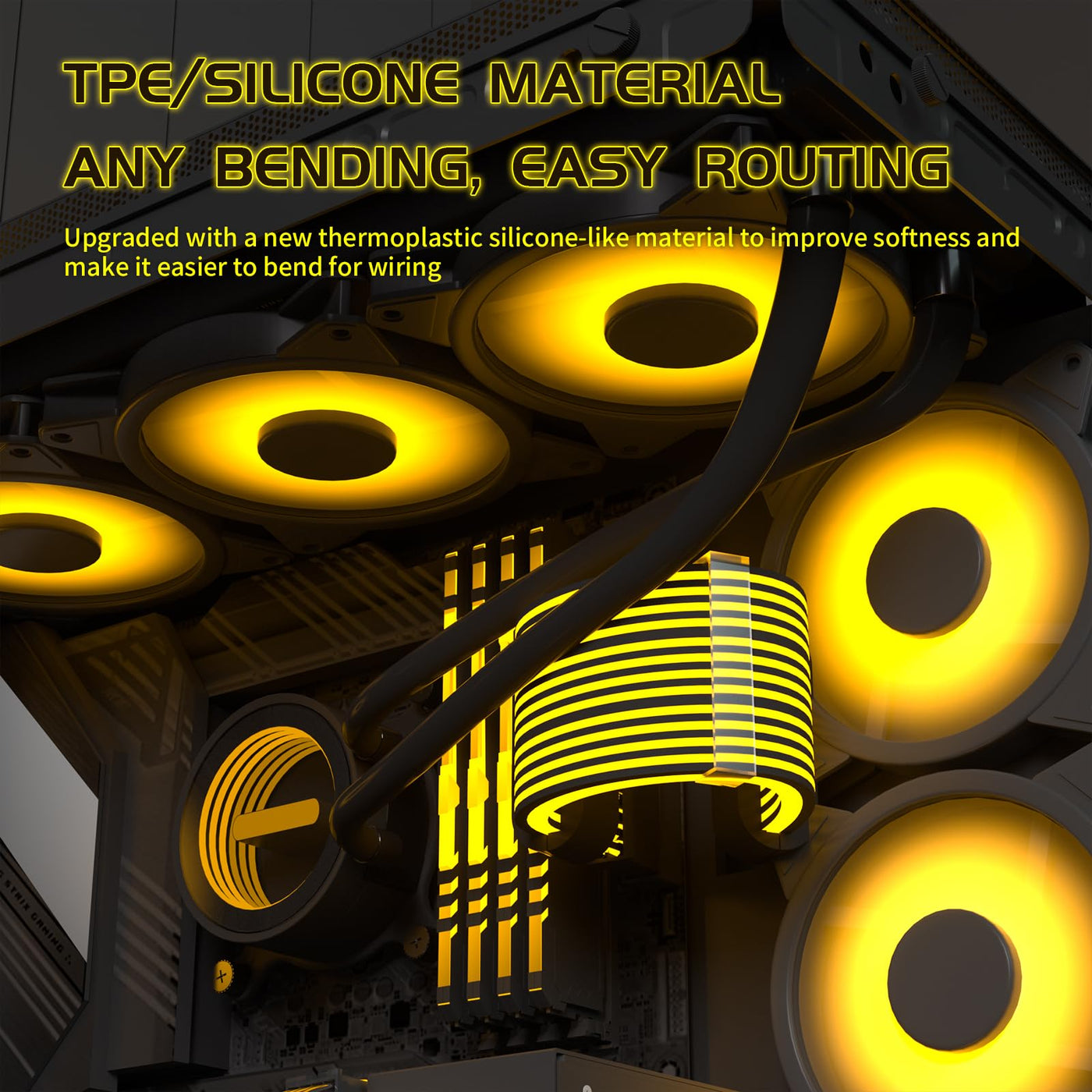 Q: What materials are used in the Sirlyr 24 Pin RGB Cable, and how do they affect performance?A: The Sirlyr RGB cable is made from high-quality TPE/silicone material, which allows for easy bending and routing while maintaining stability. The silver-plated wire core ensures stable current transfer, enhancing overall performance and reliability.