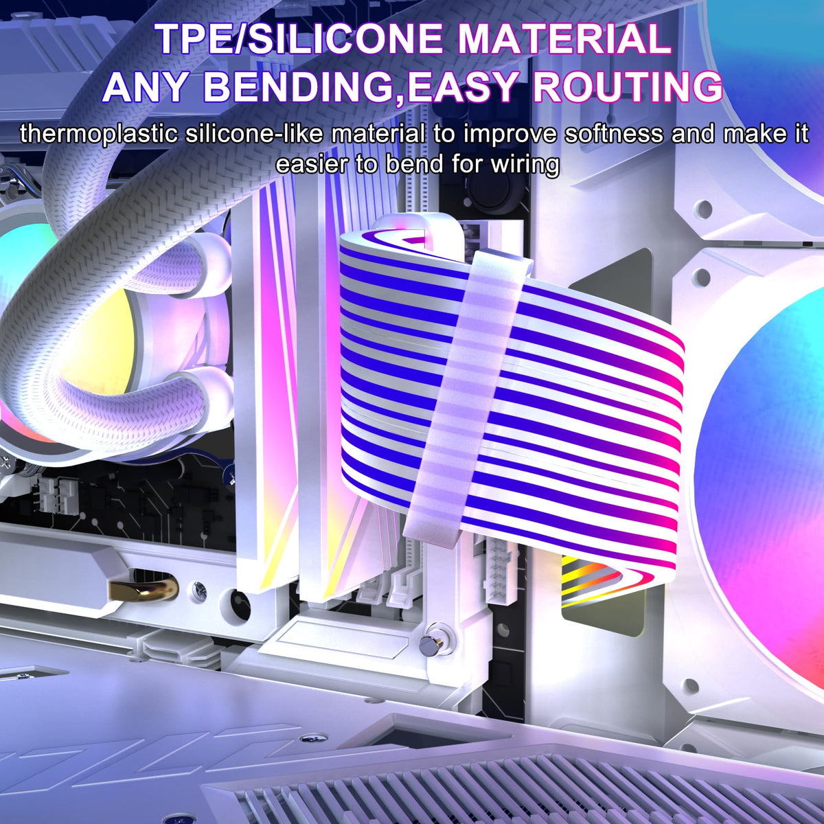 Q: What makes the Sirlyr 24 Pin RGB PSU Cables different from standard PSU cables?A: The Sirlyr 24 Pin RGB PSU Cables feature integrated RGB lighting with 360-degree illumination, providing a vibrant aesthetic that standard cables do not offer. Made from high-quality TPE/silicone material, they ensure easy bending and routing for better cable management, while the silver-plated wire core maintains stable current transfer.