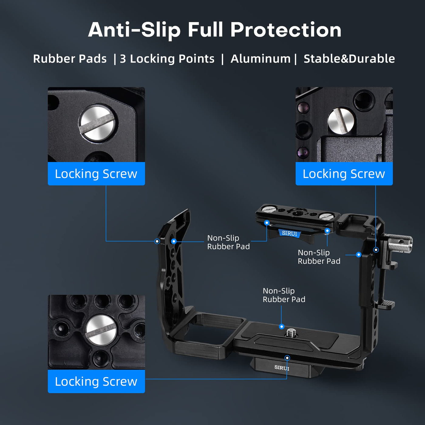 Q: How does the SIRUI cage enhance shooting stability?A: The SIRUI cage attaches to the camera at three points for added stability, while rubber pads help prevent scratches and ensure a secure fit during use.