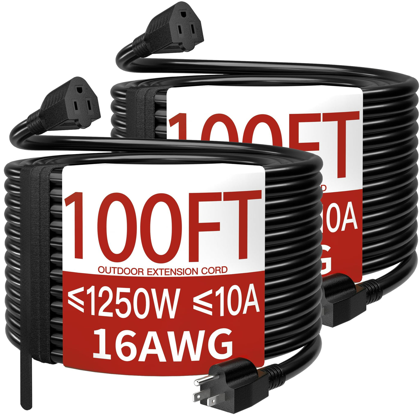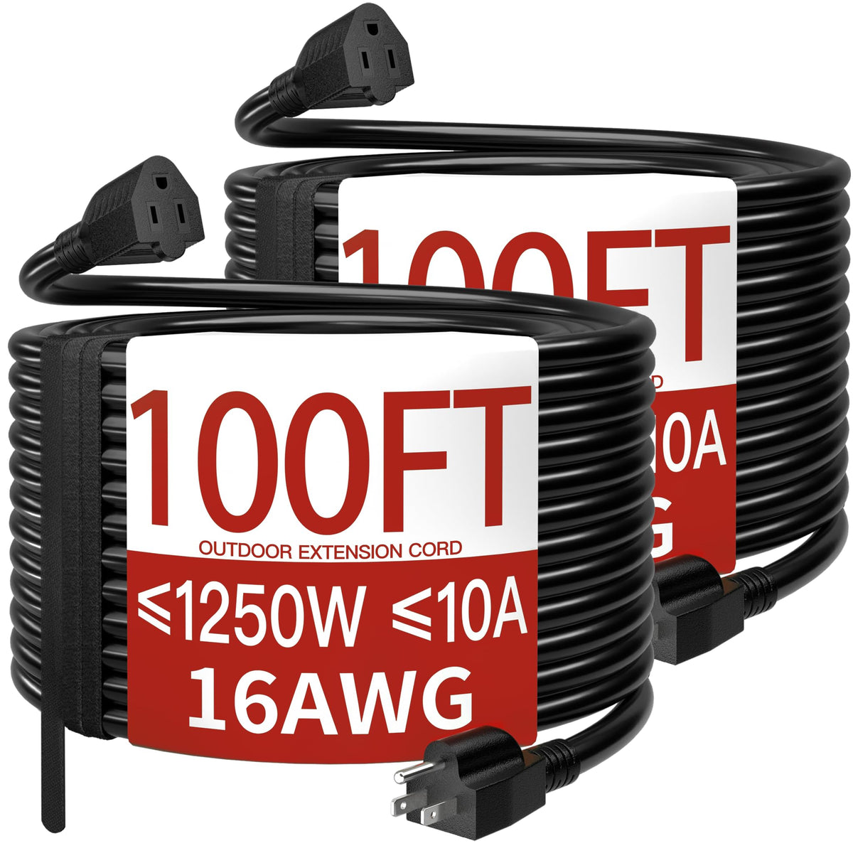 Certified And Trusted: 2 Pack 100 Ft Extension Cord Rated 10 Amps, 1250 Watts And 125 Vac; Male Nema 5-15P And Female Nema 5-15R; It Is Etl/Cetl Listed; Ensuring Its Compliance With Strict Safety Standards; Each Outdoor Extension Cord Passes A 2500V High Voltage Test Before Leaving The Factory To Ensure Safety; Reliability And Efficiency Outdoor Extension Cord Waterproof Are Capable Of Meeting Most Electrical Needs Durable Construction: Black Outdoor Extension Cord Are Made Of 3 Strands Of Pure Copper Core With Thicker Insulation In The Middle And Ip65 Vinyl Outer Jacket; The Pins Of The Extension Cord 100 Ft Male Plug Are Made Of Special Material That Will Not Rust Or Corrode; The Vinyl Outer Jacket Is Flame Retardant, Ip65 Waterproof, -58F Cold And Corrosion Resistant Weatherproof & Abrasion-Resistant: 100Ft Extension Cord Designed To Withstand The Elements; 100 Foot Extension Cord Is Waterproof And Weatherproof; Confidently Use Black Extension Cord Outside Without Worrying About Damage Caused By Wind, Sun Uv,Rain, Snow, Or Extreme Temperatures; It'S Abrasion-Resistant To Combat Drag When You'Re On Rough And Rugged Surfaces Versatile And Convenient: 2Pcs 100' Extension Cord Whether Working Outdoors On Garden Lawn, Installing Outdoor Lighting Or Using Power Tools; Indoors Electric Appliance And In Your Personal Craft Studio Using Power Tools Black Extension Cord Outdoor Will Provide The Convenience And Practicality You Need Practical Design: Plug And Socket Are Designed With Long Strain Relief At The End; 100 Ft Extension Cord Outdoor Pass 20,000 Large-Angle Bends Without Breaking Prolonging Service Life; Outdoor Extension Cord 100 Ft Remain Soft And Flexible At Low Temperatures; Preventing Them From Freezing Hard And Breaking In Cold Environments; Soft Power Cord With Attached Storage Straps For Easy Storage After Use To Avoid Clutter