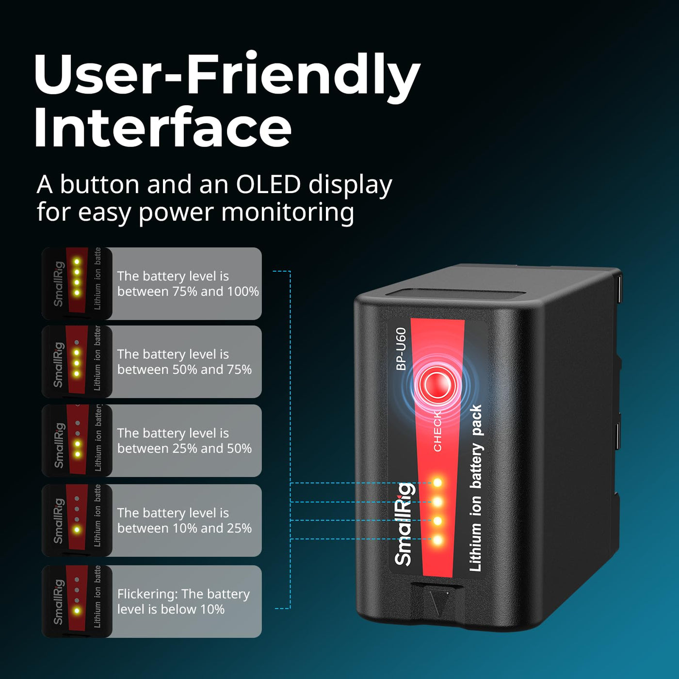 Smallrig Bp-U60 Camcorder Battery - 4670 Key Features: 1. High Capacity: Genuine 99Wh For Enduring Performance; 2. User-Friendly: Button And Led Battery Life Indicator For Easy Power Monitoring; 3. Unique Design: Innovative And Distinct Exterior; 4. Reliable: Lg Battery Cells And Built-In Intelligent Chip Ensure Safety And Durability. Capacity:14.54V/6800Mah/98.872Wh Charge Limit Voltage:16.8V Maximum Discharging Current Of Main Port:10A (Max) Discharging Cut-Off Voltage:10V Battery Level Indicator Light: Single-Click The Button To Check The Battery Level; One Light Flickering: The Battery Level Is Below 10%; One Light On: The Battery Level Is Between 10% And 25%; Two Lights On: The Battery Level Is Between 25% And 50%; Three Lights On: The Battery Level Is Between 50% And 75%; Four Lights On: The Battery Level Is Between 75% And 100%. In The Box: Bp-U60 Camcorder Battery 1 User Manual X 1 Product Dimensions: 82.3 X 69.6 X 41.6 Mm / 3.2 X 2.7 X 1.6 In Net Weight: 431.3 10.0G / 17.1 0.3Oz Package Dimensions:121 X 115 X59 Mm / 4.8 X 4.5 X 2.3 In Package Weight:598.6 10G / 21.1 0.3Oz Material(S): Abs+Pc