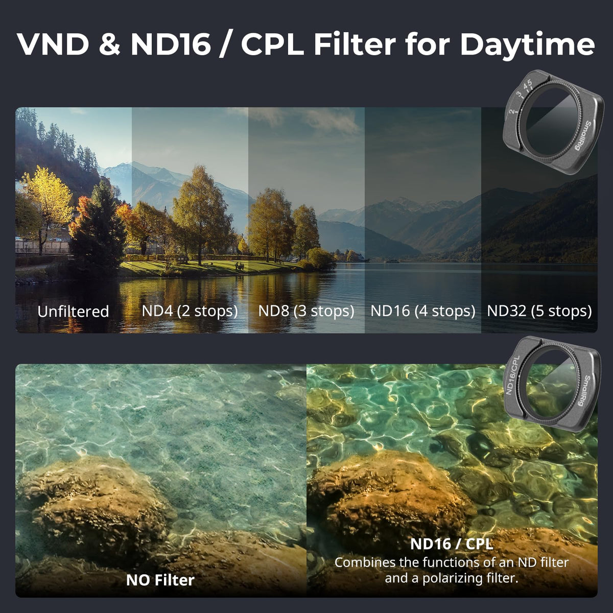 Q: Do the SMALLRIG filters affect image quality?A: No, the filters are made with high-quality optical glass that minimizes distortion and enhances overall image clarity.