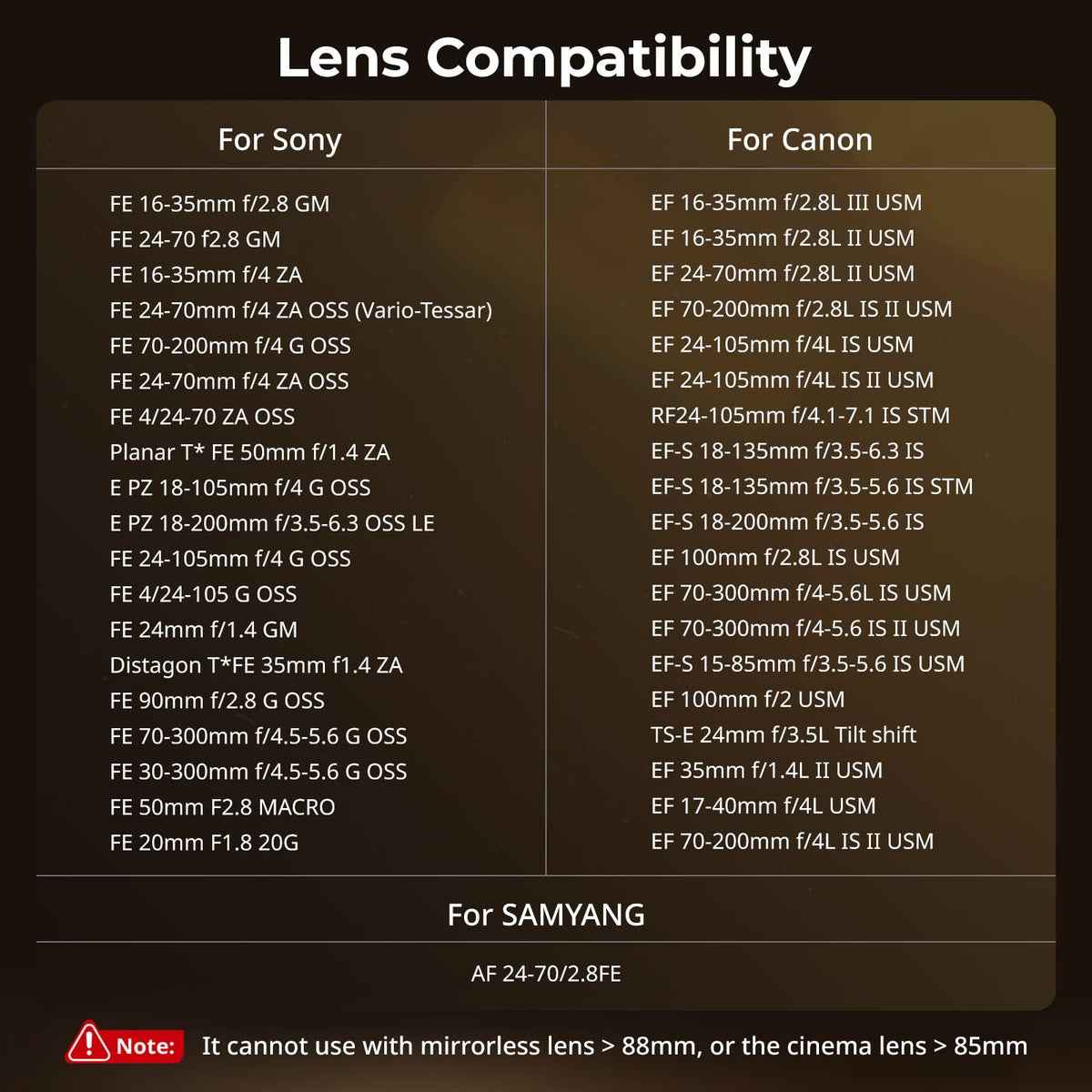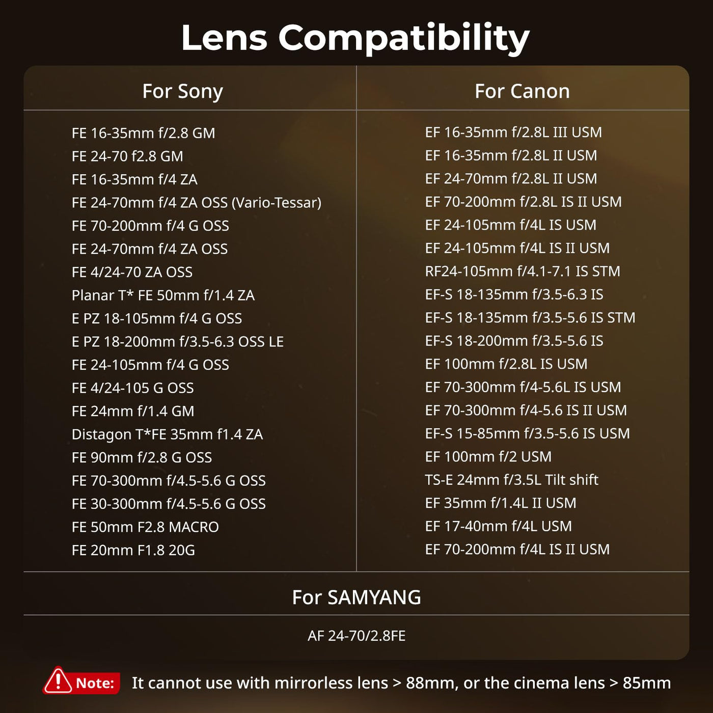 Q: Can I use this matte box with a full-frame camera?A: Yes, it is suitable for full-frame cameras and lenses. The design ensures no vignetting when the focal length is sixteen millimeters or greater.