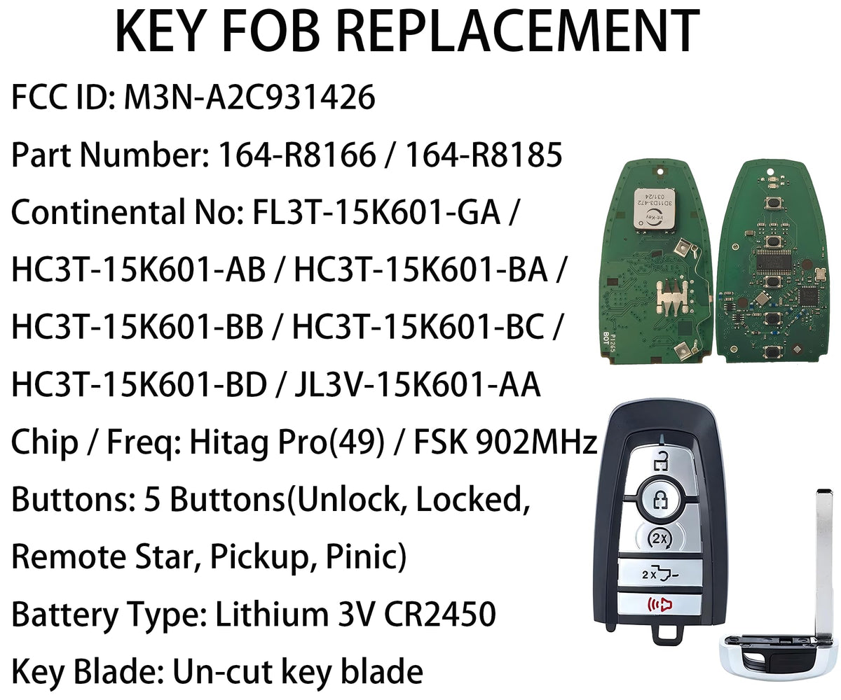 Keyless Entry Remote Key Fob, Alliskeys Replacement Proximity Smart Key Compatible With Ford F-Series 2018-2022 M3N-A2C93142600 164-R8166 5-Button Pickup 49/902Mhz
