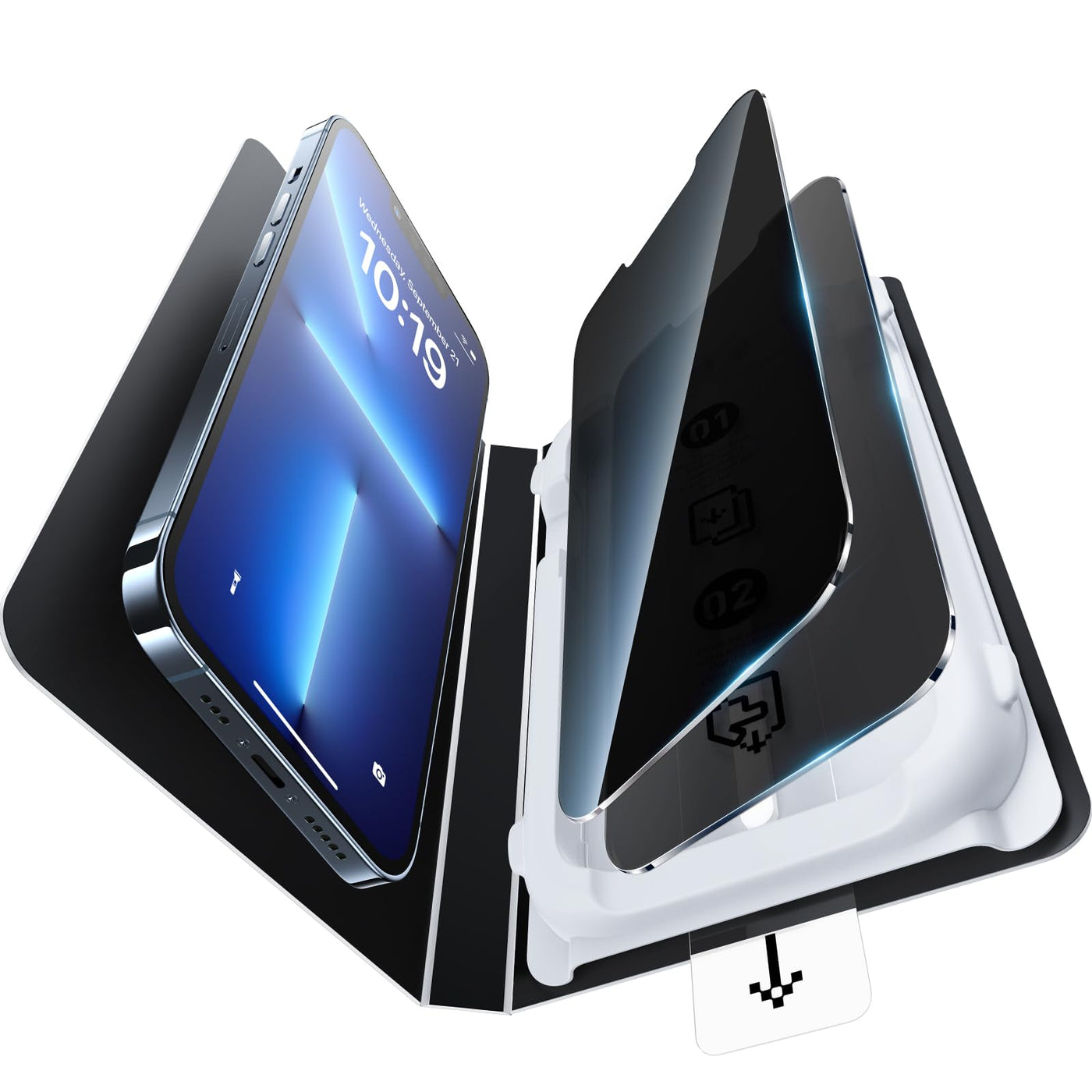Q: How does the anti-peeping technology work on this screen protector?A: This screen protector utilizes advanced glass anti-peeping technology that offers 28° privacy protection, preventing onlookers from viewing your screen from the sides, making it ideal for use in public settings.