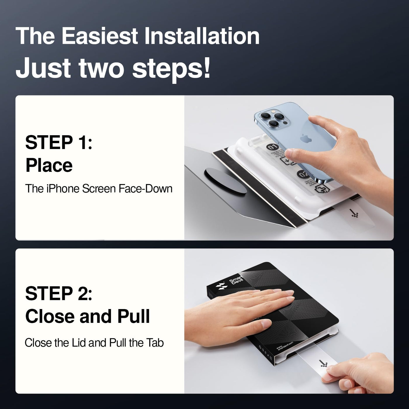 Q: Is the installation process easy for the SMARTDEVIL screen protector?A: Yes, the SMARTDEVIL screen protector features an easy installation design with an auto dust-elimination install tool, allowing for a bubble-free application in just a few seconds.