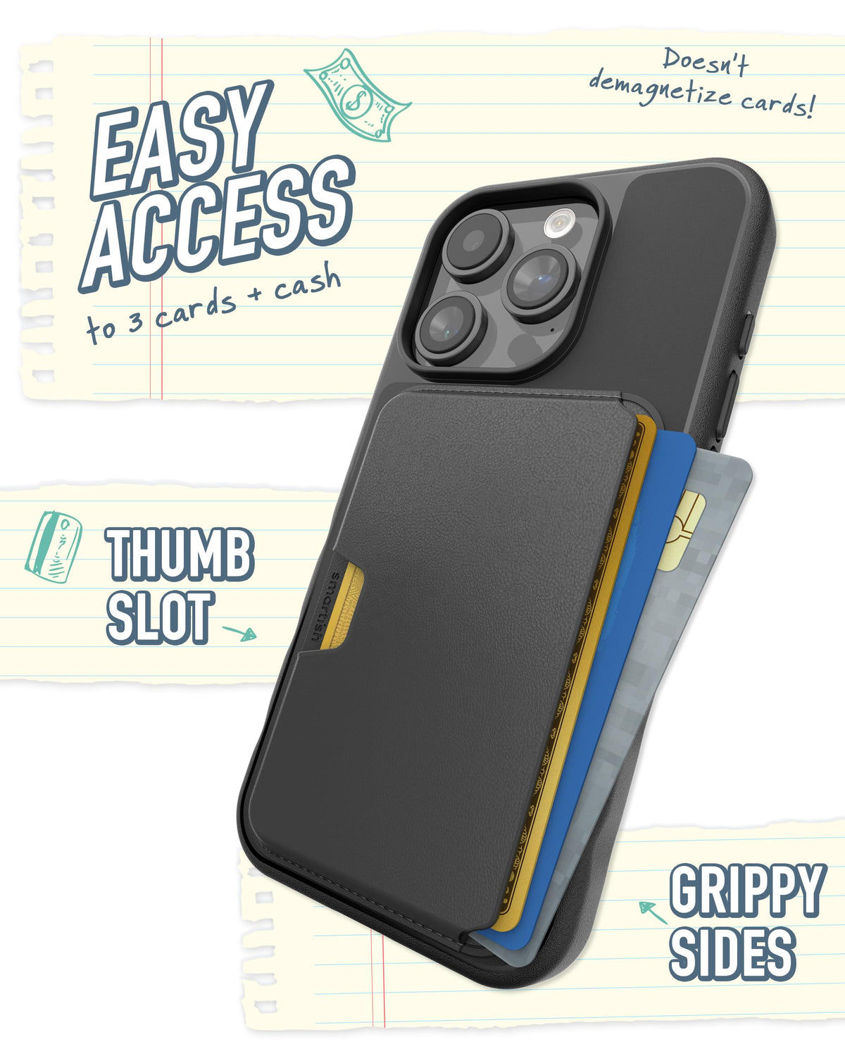 Q: Can I use the wallet feature without removing the case?A: Yes, the side-loading wallet design allows you to access your cards easily without needing to remove the case, making it convenient for everyday use.