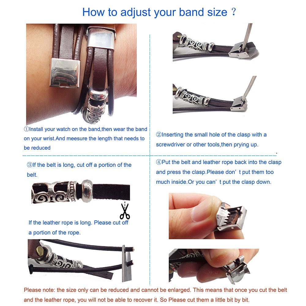 Q: How do I adjust the size of the watch band?A: The band fits wrist sizes from 5.5" to 8.5" and can be shortened by following the DIY instructions included in the box for a customized fit.
