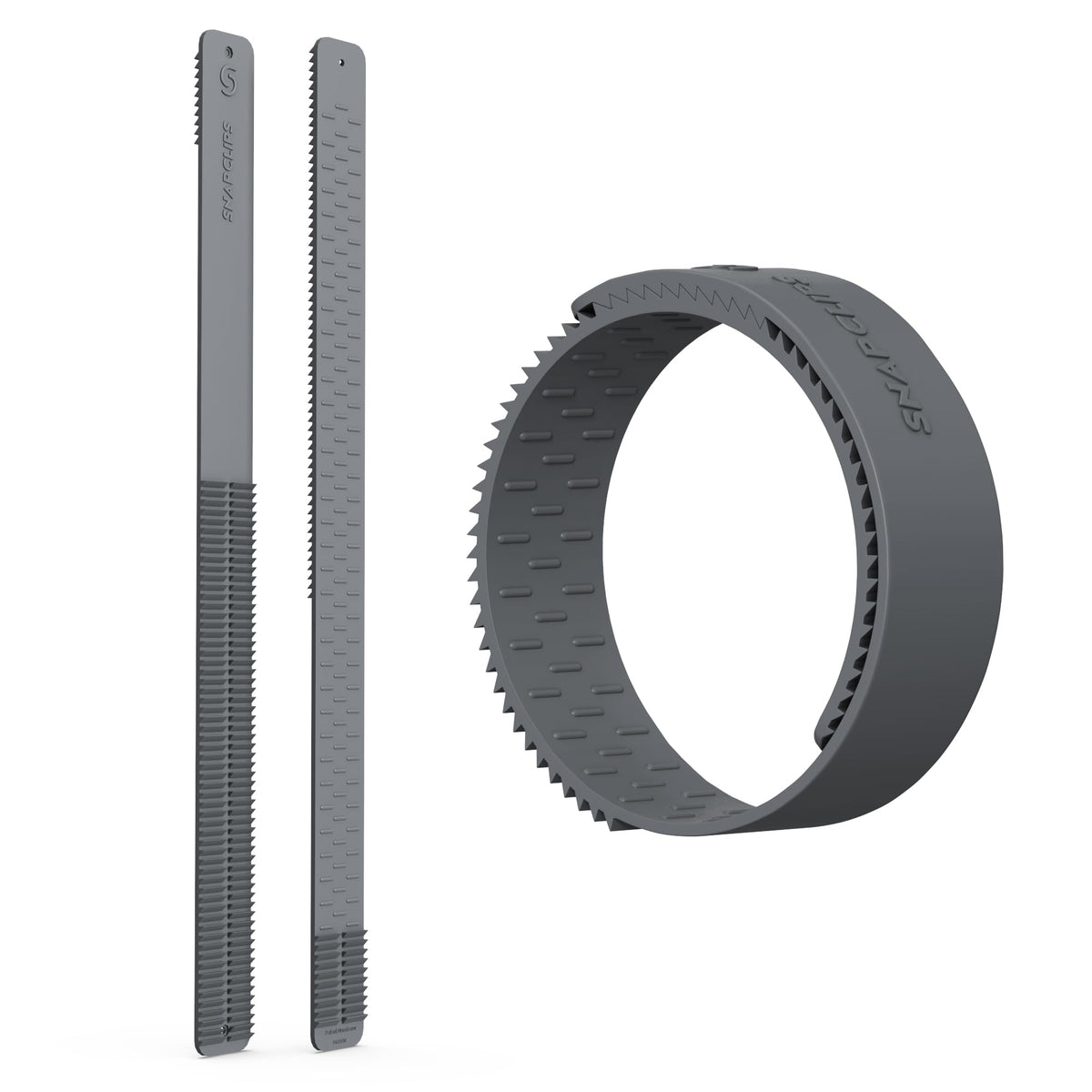 Q: What are SnapClips Storage Straps made of?A: SnapClips Storage Straps are made from heavy-duty rubber, ensuring durability and the ability to hold up to 120 lbs (54 kg) each.