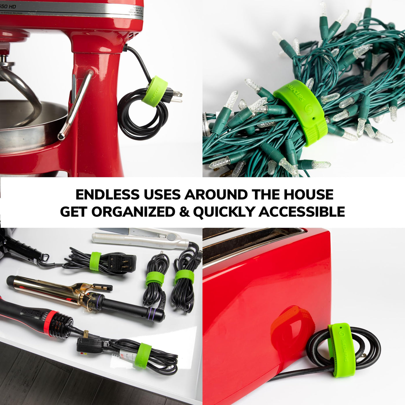 Q: How do I use SnapClips Storage Straps to organize cords?A: To use SnapClips Storage Straps, simply hit the center of the SnapClips on the object you want to organize. The strap will instantly wrap around the cords or hoses and lock into place.