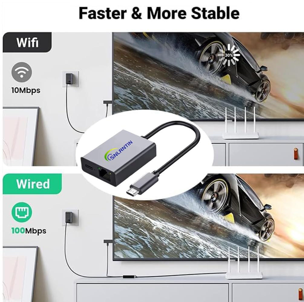 Q: How does the Snlrntin Ethernet Adapter improve my streaming experience?A: This Ethernet adapter provides a stable wired network connection with data transfer speeds of up to 100 Mbps, ensuring better performance for streaming movies and gaming. It eliminates the instability of WiFi connections, allowing for a smoother streaming experience.