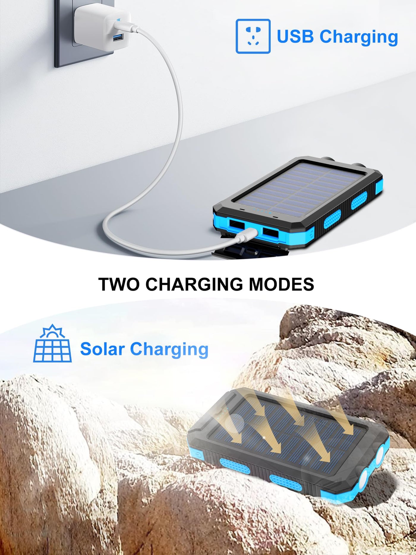 Q: Can I charge multiple devices simultaneously with the Solar Power Bank?A: Absolutely! The Solar Charger comes with dual USB output ports, allowing you to charge two devices simultaneously, making it a convenient option for sharing power with friends or family during outdoor activities.