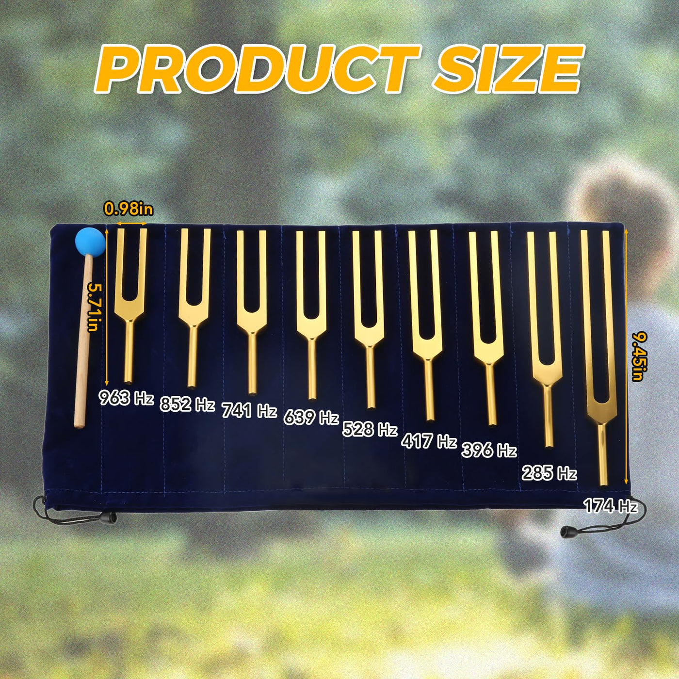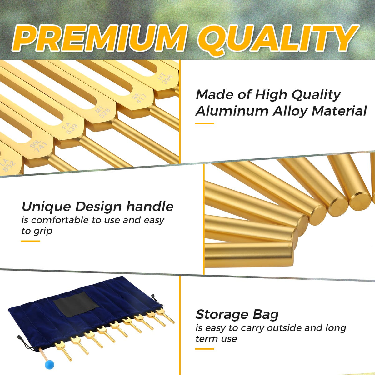 Solfeggio Tuning Fork Set, Golden 9 Tuning Forks With Rubber Hammer And Bag (174 Hz, 285 Hz, 396 Hz, 417 Hz, 528 Hz, 639 Hz, 741