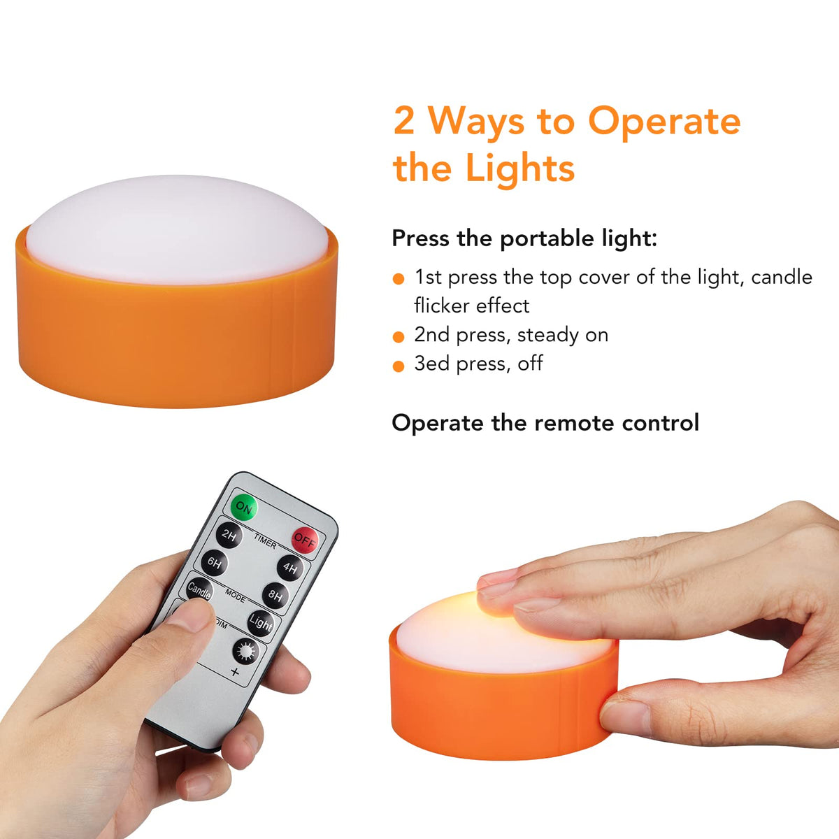 Halloween Pumpkin Lightsthese Flameless Lights Can Be Used Not Only For Halloween, But Also For Christmas, New Year, Parties, Hotels, Bars, Home Decorations, Perfect For Kitchens, Closets, Bookshelves, Bedrooms, Pantries, Dressers. Feature.1. Safe To Use.They Are Safe And Smokeless, Will Not Blow Out And No Need To Worry About The Danger Of Flames, Especially When You Have Children And Pets Around.2. Remote Control With Timer Function.With Memory Function, Automatically Saves The Last Setting After Power Failure; 2 Different Modes Can Be Set; 5 Brightness Levels Adjustable; 2/4/6/8 Hours Timer3.2 Lighting Modes.In Candle Mode.The Light Flickers And Glows Like A Candlein Light Mode.The Light Is Always On Specification.Material: Plasticshape: Round Pumpkin Shapesize: 2.55 Inches In Diameter, 1.57 Inches In Heightcolor: Amberbatteries Required: 3 Aaa (Not Included)Set Includes.4 * Led Pumpkin Light1 * Remote Control1 * Manualattention!1. If The Product Is Not Used For A Long Time, Please Remove The Batteries.2. To Activate The Remote Control, Please Remove The Plastic Insulation Sheet.