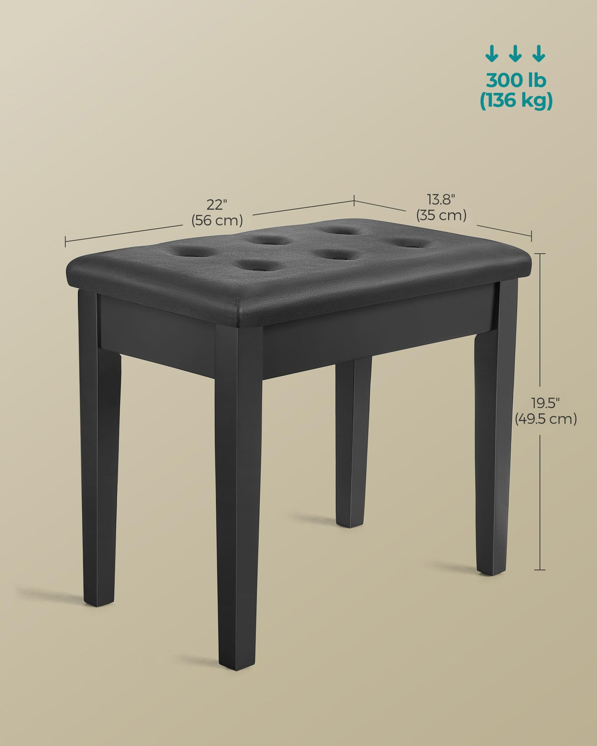 [Ideal Companion] Hours Of Piano Practice Can Be Difficult On A Hard And Stiff Stool; This Piano Bench With A Padded, Upholstered Seat Lets You Sit On It Comfortably To Prepare A Perfect Performance | [Storage Compartment] The Built-In Compartment Under The Seat Provides A Convenient Hidden Storage Space For Your Sheet Music And Books; The Flip Top Is Easy To Open With A Quality Hinge | [Wtih Comfort And Style] The Highly Resilient, Soft Cushion Provides Continuous Comfort During Long Practices, And The Tufted Black Faux Leather Brings A Big Dose Of Timeless Charm And Character To Your Home | [Details Matter] The Legs Of This Stool Are Solid Wood And Can Support Up To 300 Lb, While The Rubber Feet Free Your Floors From Scratches; It Can Also Be Used As A Vanity Stool When Applying Your Makeup | [Effortless Assembly] Assembly Shouldn