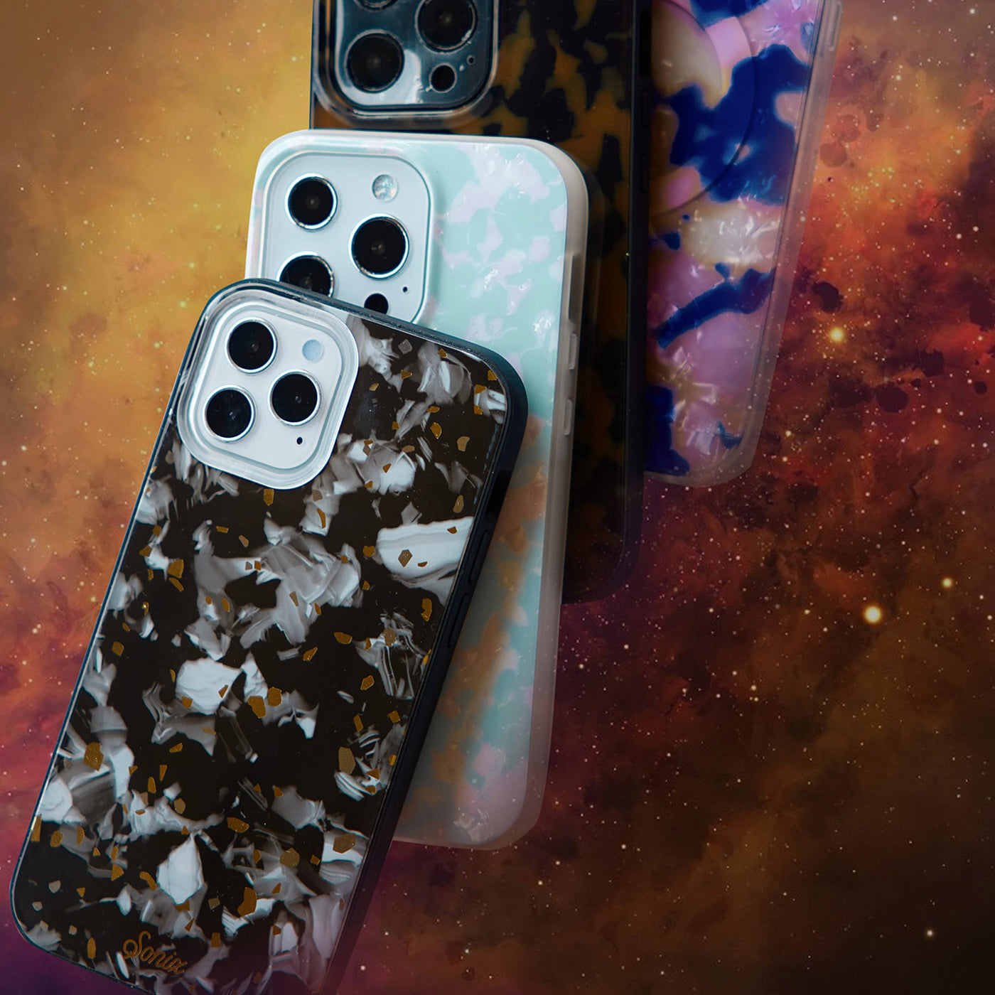 Q: What is the design style of the Sonix Case for iPhone 13 Pro?A: The Sonix Case features a stylish Nebula Tort design with a black tortoise shell pattern and highlights of gold and white, combining fashion with functionality.