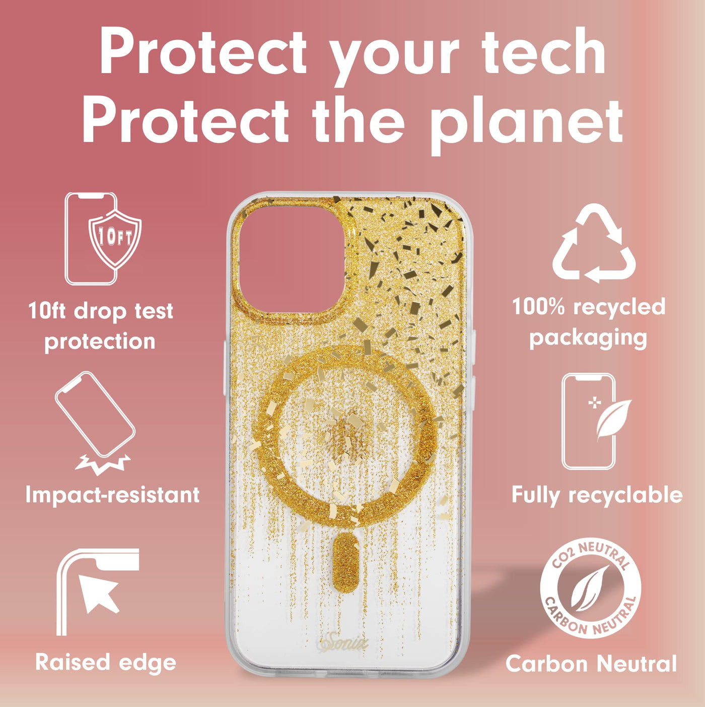 Q: What makes the design of the Sonix Case unique?A: The Sonix Case combines a classic clear design with a dazzling shower of gold glitter and foil, making it a stylish accessory that adds sparkle to your iPhone 14 or iPhone 13.