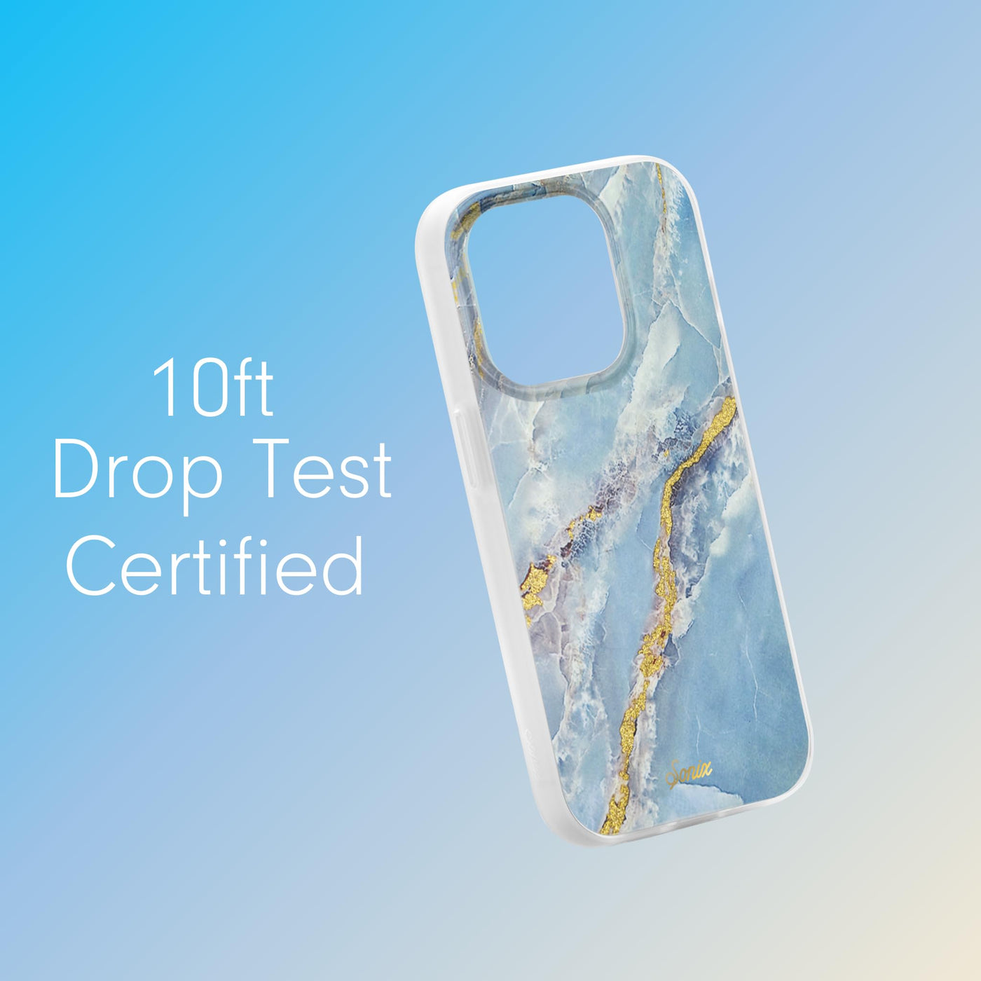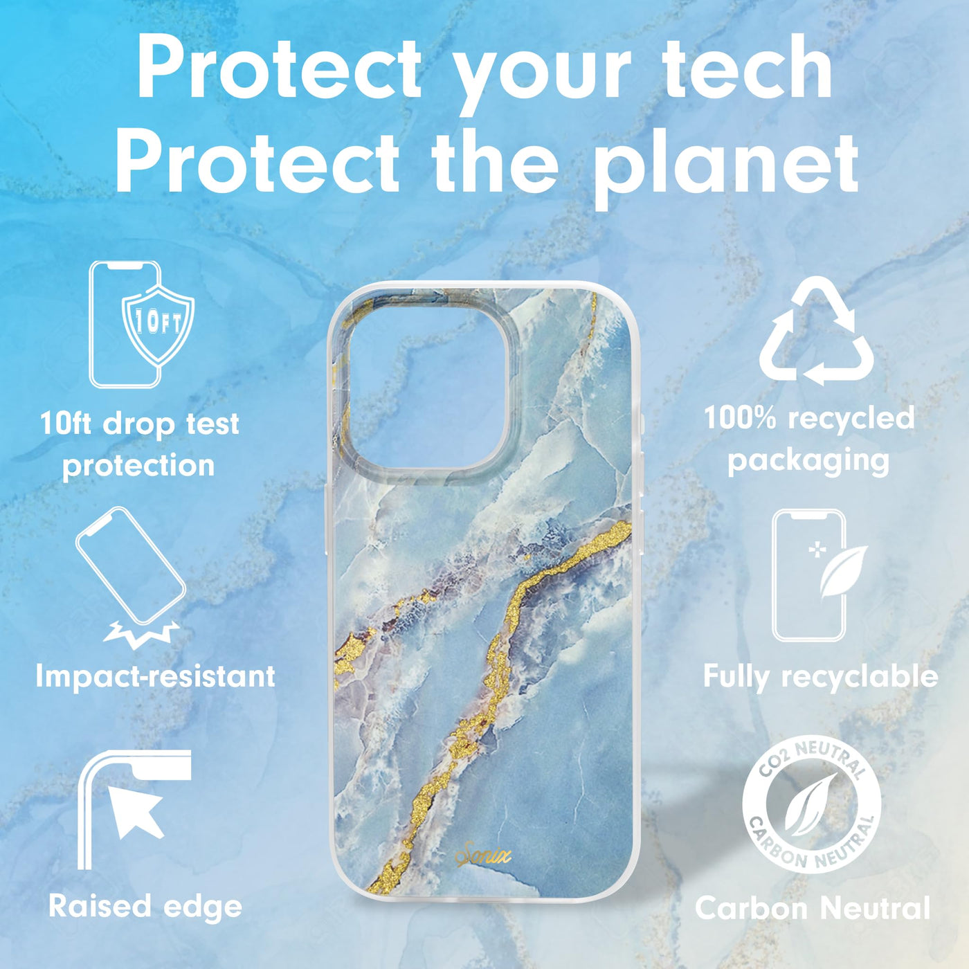 Compatible With Magsafe: Features Built-In Magnets Designed To Support Magnetic Wireless Charging | 10-Foot Drop Tested: Our Protective Case Features A Scratch-Resistant Coating, Raised Shock-Absorbent Sides, Grooved Impact-Resistant Corners, And A Raised Edge For Camera Protection | This Cute Iphone Case Features A Striking Icy Blue Marble Design With Glittering Metallic Gold Veins | Protect Your Tech And The Planet: Our Phone Cases Are Made From 100% Thermoplastic Polyurethane (Tpu) And Packaged Using 100% Recycled, Recyclable Paper | Includes Sonix Lifetime Warranty