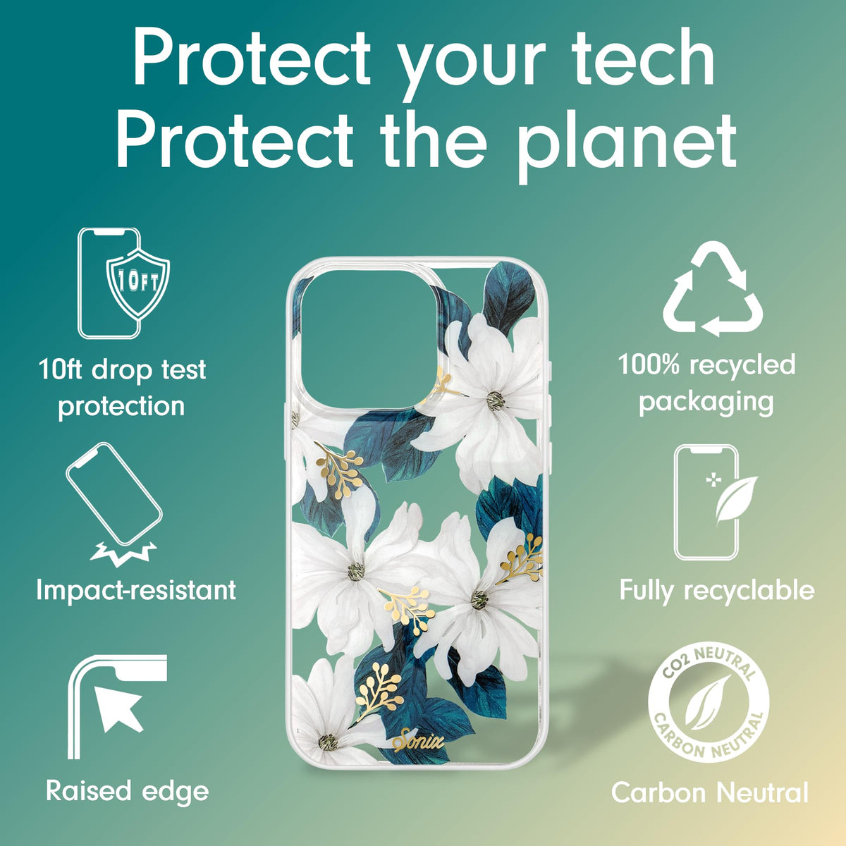Compatible With Magsafe: Features Built-In Magnets Designed To Support Magnetic Wireless Charging | 10-Foot Drop Tested: Our Protective Case Features A Scratch-Resistant Coating, Raised Shock-Absorbent Sides, Grooved Impact-Resistant Corners, And A Raised Edge For Camera Protection | Features Unique Classic Delicate White Flowers With Teal Leaves And Gold Foiled Pollen Details | Protect Your Tech And The Planet: Our Phone Cases Are Made From 100% Thermoplastic Polyurethane (Tpu) And Packaged Using 100% Recycled, Recyclable Paper | Includes Sonix Lifetime Warranty