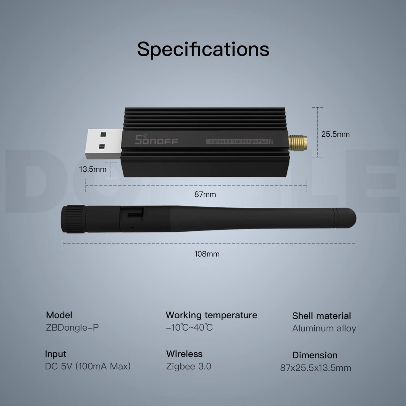 Q: What are the benefits of using an external antenna with the SONOFF USB Dongle?A: The external antenna included with the SONOFF Zigbee 3.0 USB Dongle Plus enhances the signal strength and range, allowing for better communication with Zigbee devices even in larger homes or spaces where signal interference may occur.