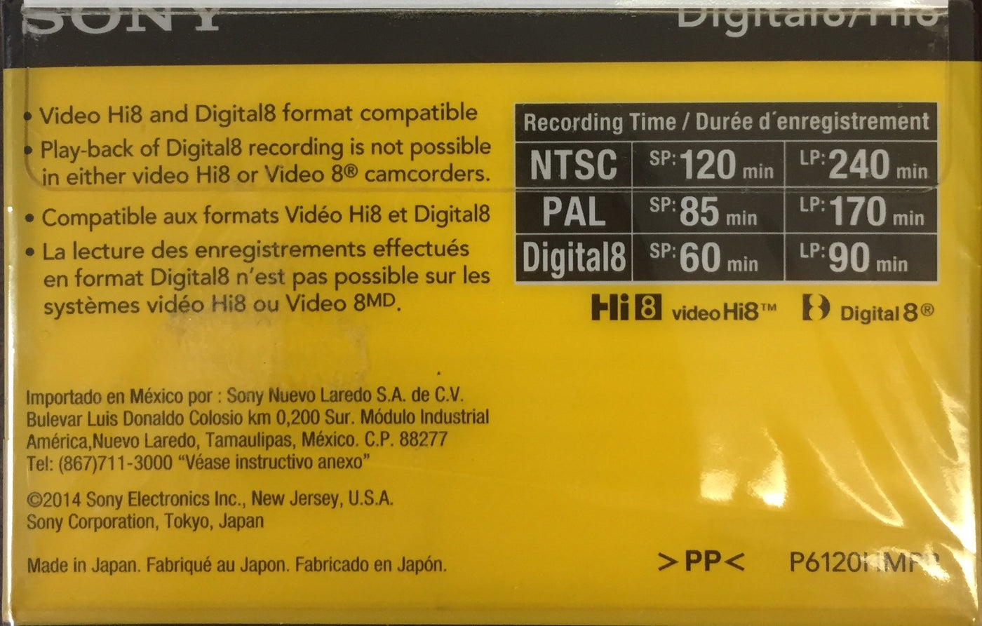From the ManufacturerGet it all on tape with Sony's P-6120HMP Hi8 Video Cassette. Perfect for capturing your special occasions, these tapes feature Enhanced Ultra Fine Cosmicilite Metal Particles, and maintain high RF output even after 200 repeated playbacks. This tape can be used for Hi8 or Digital8 recording. For Hi8 recording, you get 120 minutes of recording time in SP mode, or 240 minutes in LP mode. For Digital8 recording, you get 60 minutes of recording time in SP mode, or 90 minutes in LP mode.