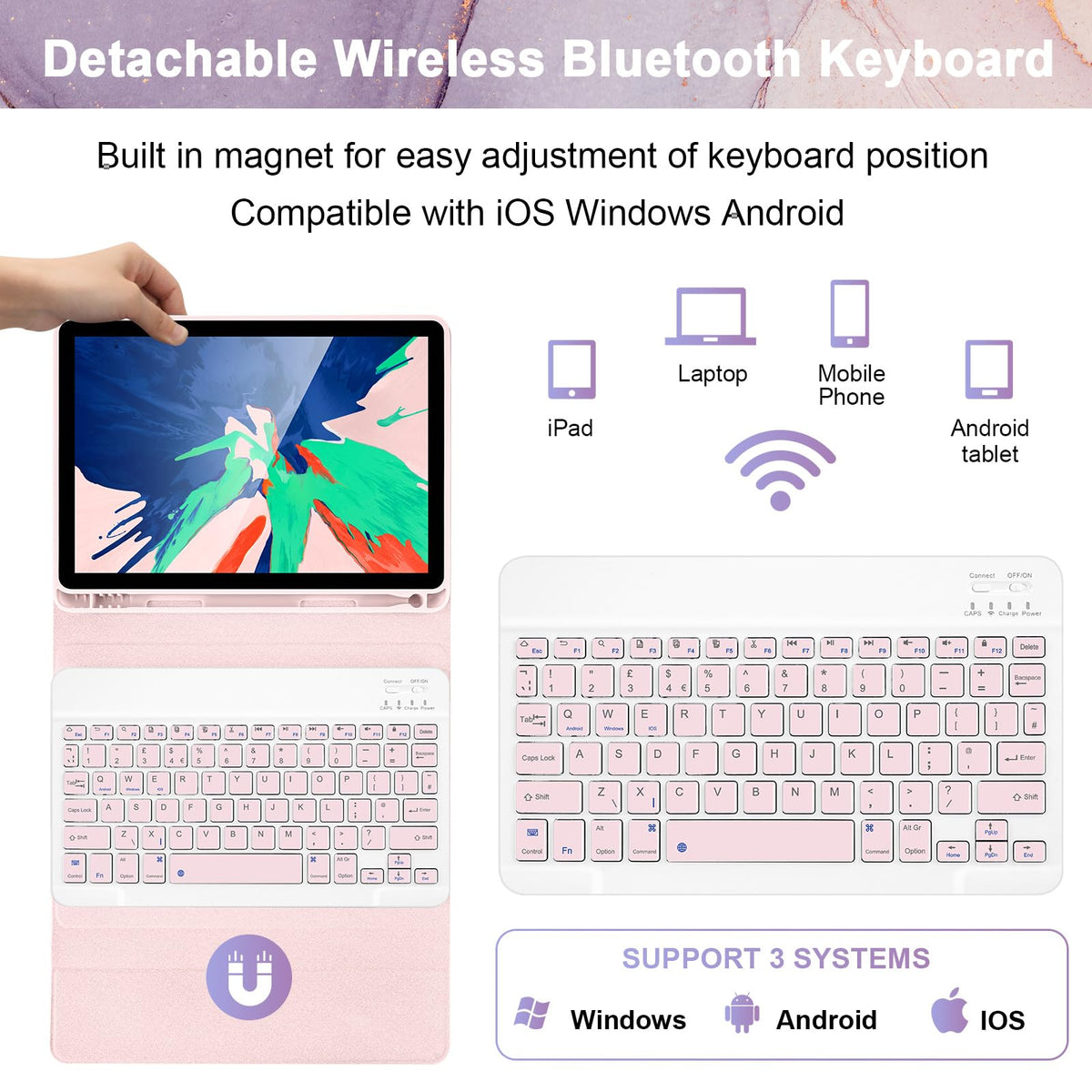 Specifications: Bluetooth Version: V.3.0 Working Distance: 10M Operation Voltage: 3.0-4.2 V Operation Current: ≪2.5 Ma Standby Current: ≪0.3 Ma Sleeping Current: ≪40 Ua Charging Current: ≫200 Ma Standby Time: 100 Days Charging Time: 3-4 Hours Battery Capacity: 180 Ma Uninterrupted Working Time: 100 Hours Product Size:27Cm*20Cm*2.3Cm Package Includes: 1 X Ipad Keyboard Case 1 X Wireless Bluetooth Keyboard 1 X Type-C Charing Cable 1 X User Manual
