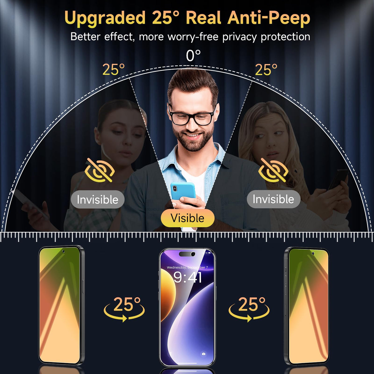 Q: How does the privacy feature work on the sorlnern screen protector?A: The privacy feature blocks side views, ensuring that only the person directly in front of the screen can see the content, which enhances security and privacy.