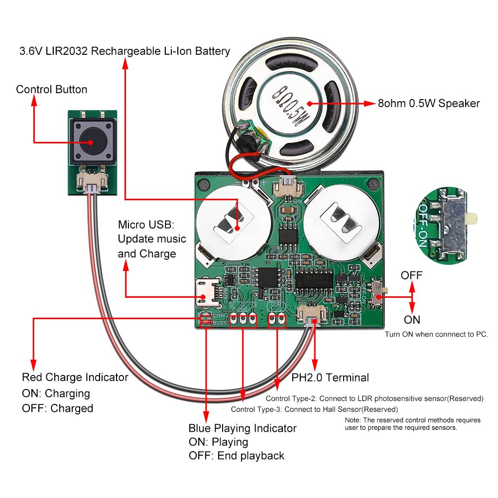 How To Use? 1.Turn On The Switch 2.Press The Button To Play The Default Music 3.Press Again To Stop Playing 4.Connect The Module With A Usb Data Cable To A Computer, Then The Computer Will Recognize It As A Usb Drive With About 8M Limit. 5.You Will See A Txt Formatted Document And The Default Music In It. Delete The Default Music In It And Then Replace It With Your Favorite Mp3 Music. And Open The Document, You Can Modify The Volume And Playback Mode, Just Modify The Numbers. 6.Plug Off The Usb Cable And Play Music.