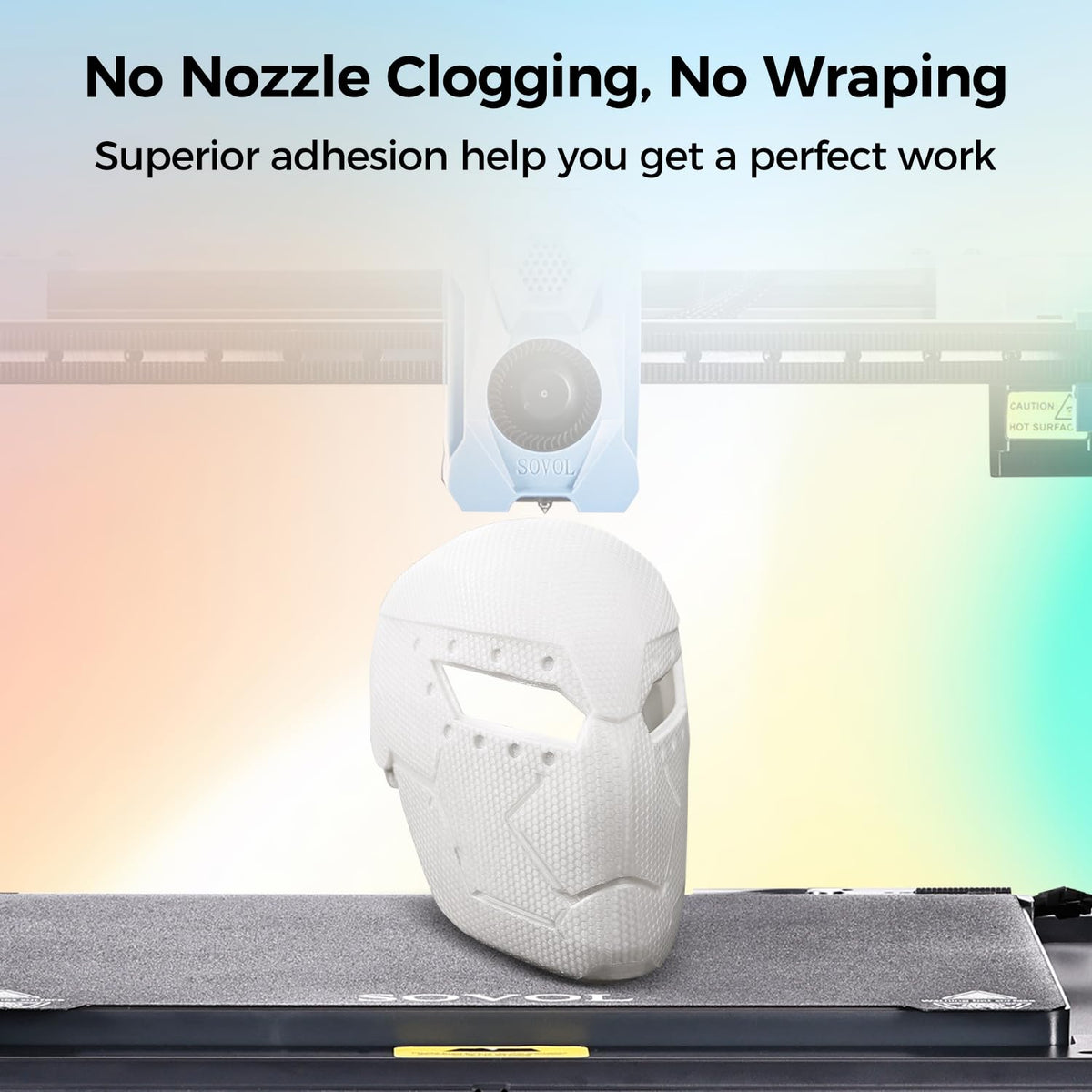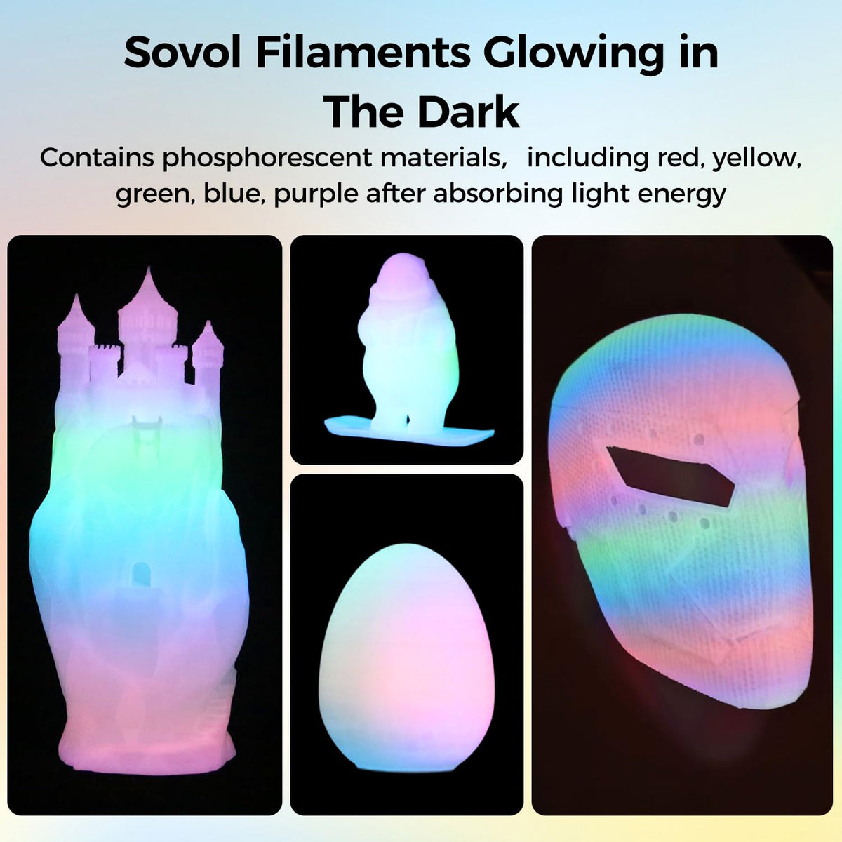 Q: What makes Sovol glow in the dark PLA filament unique?A: Sovol glow in the dark PLA filament is unique because it contains phosphorescent materials that allow it to glow after absorbing light energy. It offers a vibrant gradient of colors when viewed in the dark, including pink, red, yellow, green, blue, and purple.