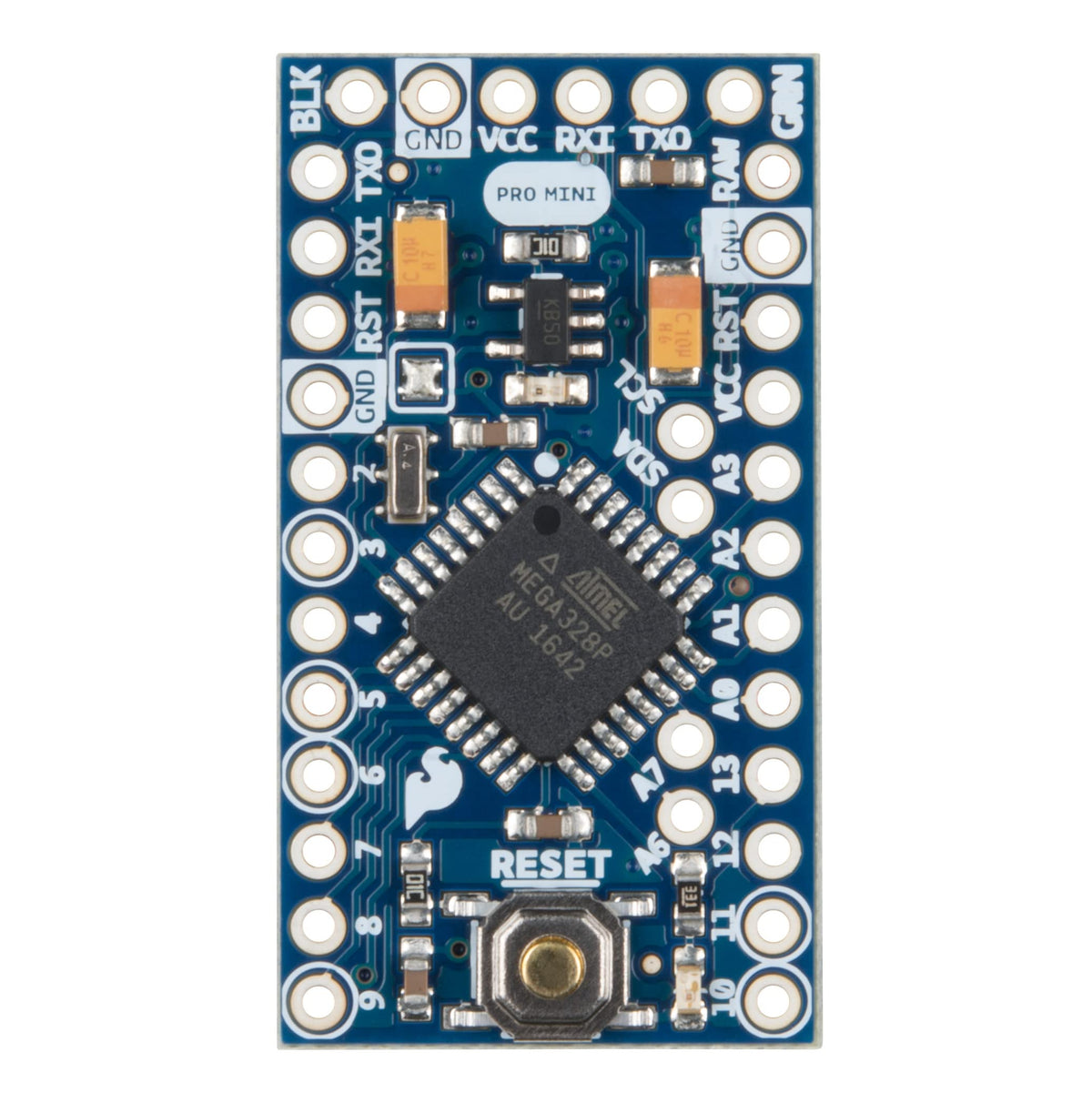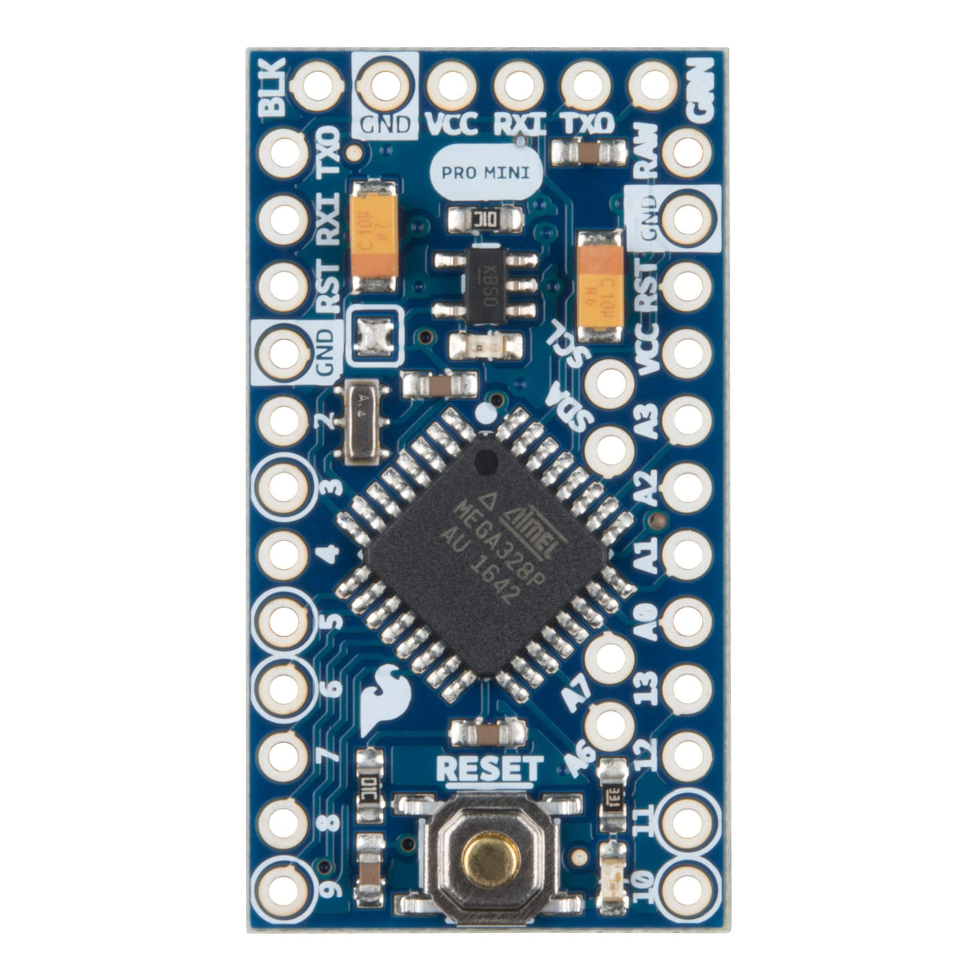 It'S Blue! It'S Thin! It'S The Pro Mini! Sparkfun'S Minimal Design Approach To Microcontrollers. This Is A 5V Board Running The 16Mhz Bootloader. Pro Mini, Compatible With Arduino, Does Not Come With Connectors Populated So That You Can Solder In Any Connector Or Wire With Any Orientation You Need. We Recommend First Time Arduino Ide Platform Users Start With The Arduino Uno R3. It'S A Great Board That Will Get You Up And Running Quickly. The Pro Series Is Meant For Users That Understand The Limitations Of System Voltage (5V), Lack Of Connectors, And Usb Off Board.We Really Wanted To Minimize The Cost Of A Board That Is Compatible With Arduino. In Order To Accomplish This We Used All Smd Components, Made It Two Layer, Etc. This Board Connects Directly To The Ftdi Basic Breakout Board And Supports Auto-Reset. The Pro Mini Also Works With The Ftdi Cable But The Ftdi Cable Does Not Bring Out The Dtr Pin So The Auto-Reset Feature Will Not Work. There Is A Voltage Regulator On Board So It Can Accept Voltage Up To 12Vdc. If You'Re Supplying Unregulated Power To The Board, Be Sure To Connect To The ''Raw'' Pin And Not Vcc.The Latest And Greatest Version Of This Board Breaks Out The Adc6 And Adc7 Pins As Well As Adds Footprints For Optional I2C Pull-Up Resistors! We Also Took The Opportunity To Slap It With The Oshw Logo.