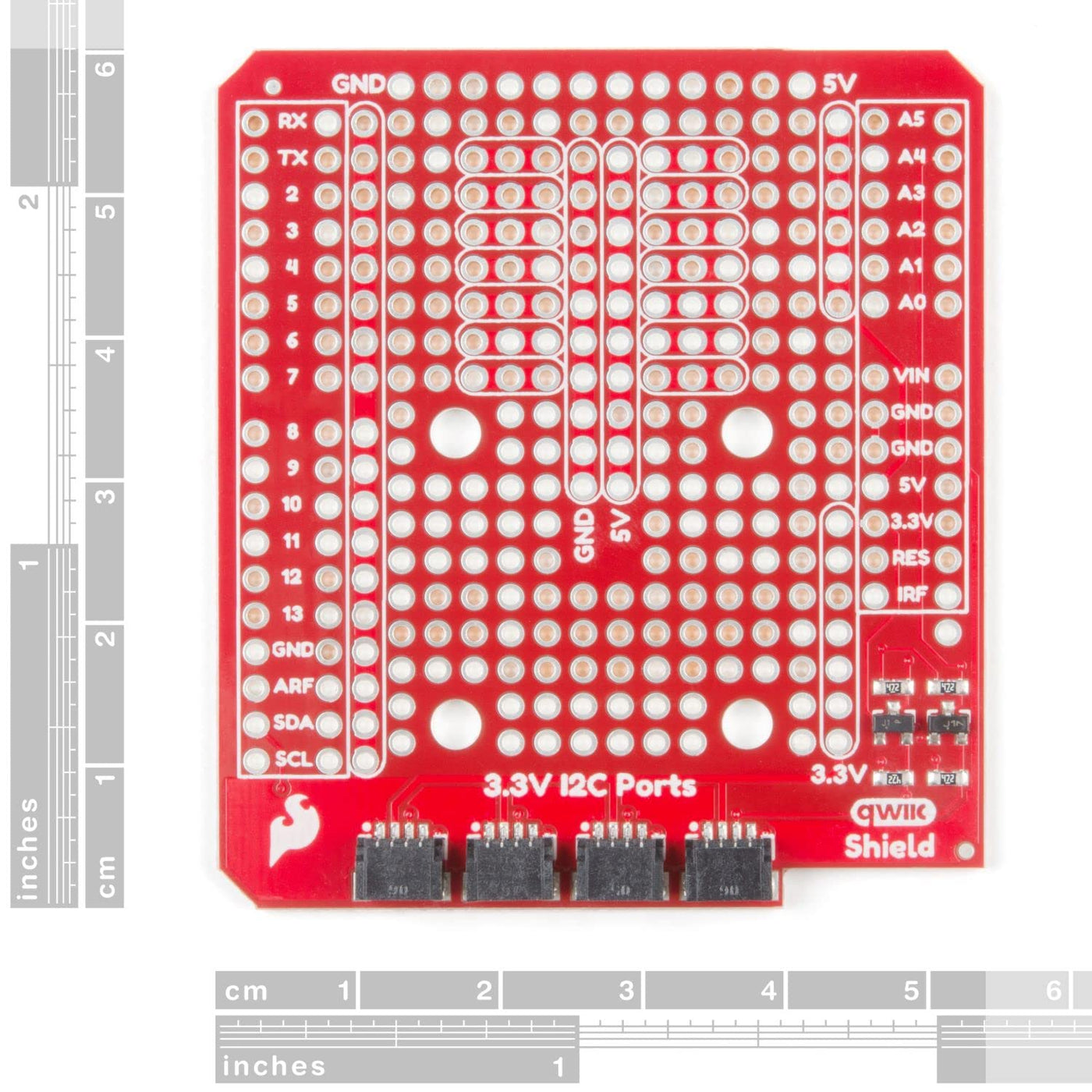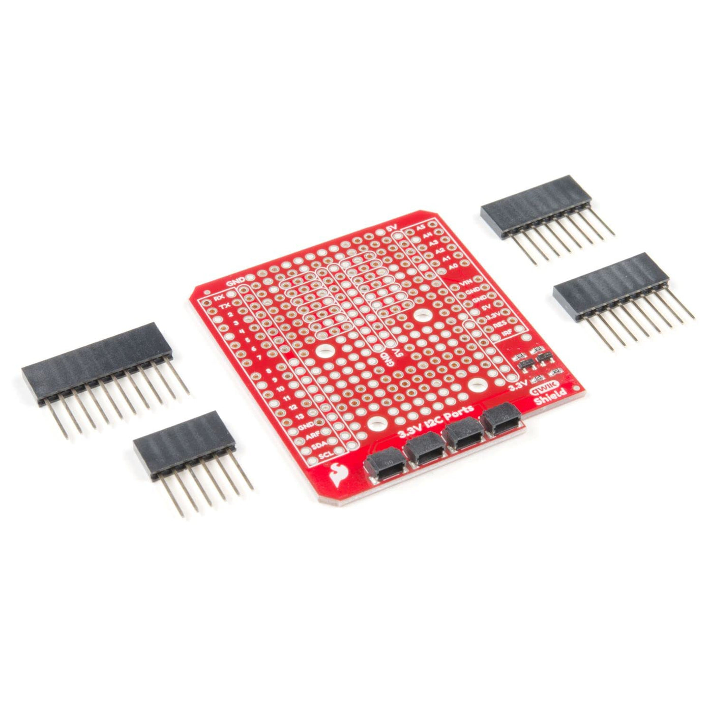 The Sparkfun Qwiic Shield Is An Easy-To-Assemble Board That Provides A Simple Way To Incorporate The Qwiic Connect System With Your Compatible With Arduino Device. This Shield Connects The I2C Bus On Your Compatible With Arduino Board To A Series Of Sparkfun Qwiic Connectors And Provides The Circuitry To Convert The 5V Given To The 3.3V Required By I2C Boards In Our Qwiic System. As Long As Your Devices Are On Different Addresses, The Qwiic System Allows For Daisy Chaining, Meaning You Can Stack As Many Sensors As Youd Like To Create A Tower Of Sensing Power! The Qwiic Shield Has Four Qwiic Connection Ports, All On The Same I2C Bus, As Well As A Large Prototyping Area To Design And Make Your Own Unique Circuits. The Shield Also Has A Few 3-By-1 Rails To Help With Prototyping, As Well As Buses For Ground, 5V And Even 3.3V. We Have Included Four Mounting Ports In The Same Design As Our Qwiic Sensors, Allowing You To Affix Your Small Board To The Top Of The Shield.This Shield Is A Great Retrofit For Any Uno You May Have. What A Solder Free Solution? Skip The Shield And Checkout The Sparkfun Blackboard Which Has The Qwiic System Built In!The Sparkfun Qwiic Connect System Is An Ecosystem Of I2C Sensors, Actuators, Shields And Cables That Make Prototyping Faster And Less Prone To Error. All Qwiic-Enabled Boards Use A Common 1Mm Pitch, 4-Pin Jst Connector. This Reduces The Amount Of Required Pcb Space, And Polarized Connections Mean You Cant Hook It Up Wrong.Note: This Includes R3 Headers, But They Are Not Pre-Soldered Onto The Board, So Some Assembly Will Be Required When Putting The Shield Together.
