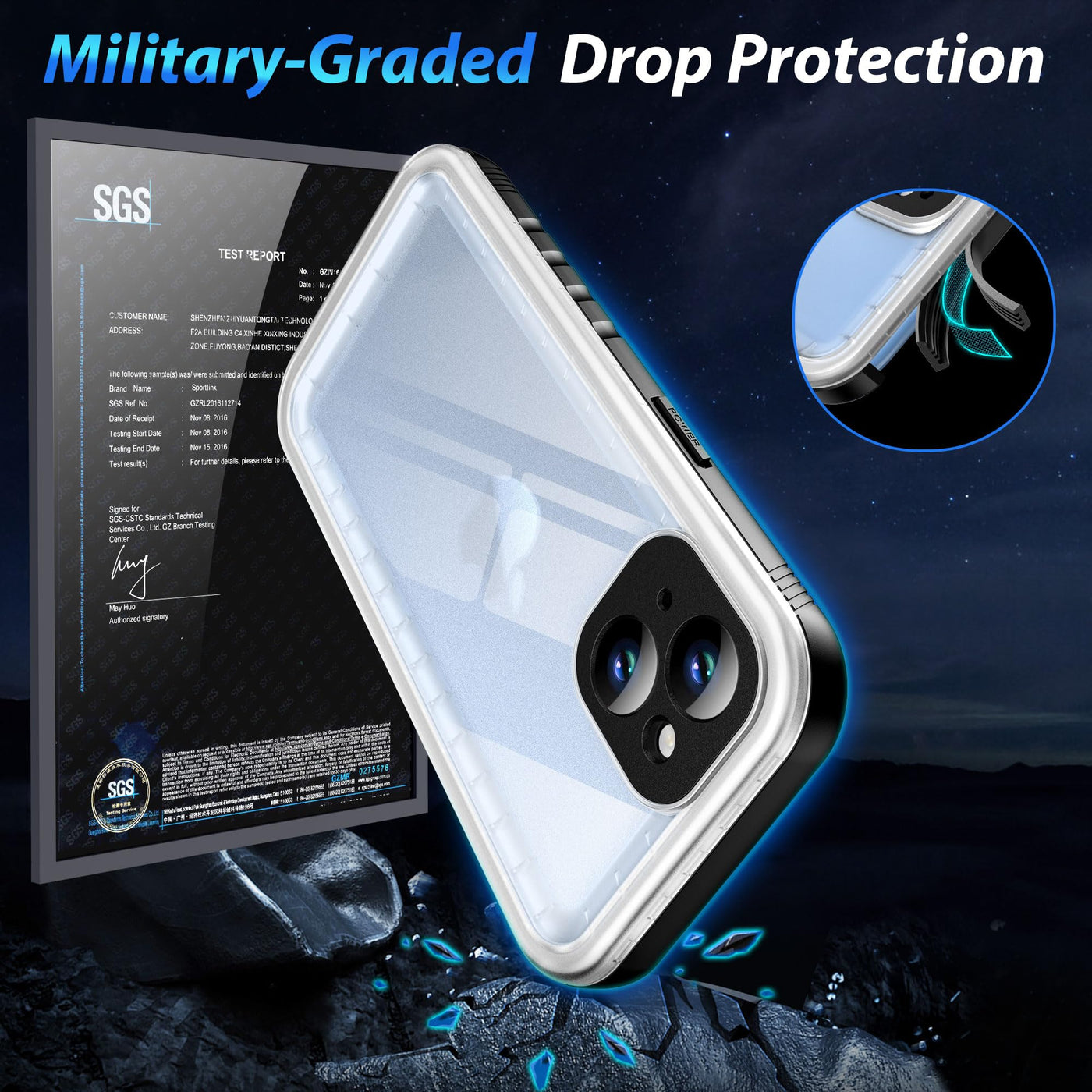 Q: Does the case offer shock protection?A: Yes, the SPORTLINK case meets the MIL-STD-810G standard, providing real shock protection and safeguarding your iPhone 13 from drops up to 6.6 feet (2 meters).