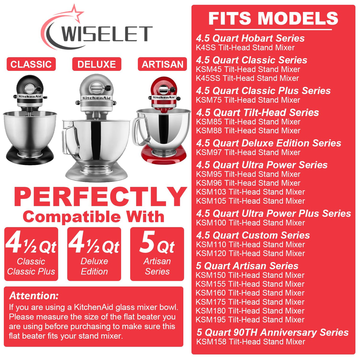 Q: What KitchenAid mixers are compatible with the Stainless Steel Flat Beater?A: The Stainless Steel Flat Beater is designed to fit KitchenAid 4.5qt and 5qt Tilt-Head Stand Mixers, including models K45SS, KSM75, KSM90, KSM110, KSM125, and KSM150.