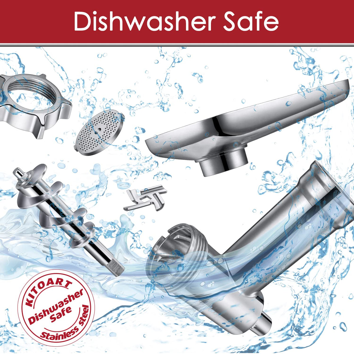 [Perfect Stainless Steel Grinder Attachment For Kitchenaid] Our Stainless Steel Meat Grinder Attachment Fits All Kitchenaid Stand Mixers, And Will Provide You With A Perfect Food Processing Experience. It Is A Great Kitchen Cooking Assistant For Cooking Lovers And Housewives. The Best Gift For Kitchenaid Mixers' Fans. (Not Created By Kitchenaid Brand) [All Stainless Steel Designed] Made Of Premium Stainless Steel, Far Superior To Plastic/Aluminum Alloy Models. Its Sturdiness Ensures That It Will Provide You With Long-Term Use. Under The Premise Of Using Safely, Producing Healthy Food Materials Efficiently. [Upgraded & Complete Accessories] Package Includes 1 Grinder(Grinder Body, Food Tray, Grinder Worm, Locking Ring, Food Pusher), 3 Grinding Blades, 4 Grinding Plates, 3 Sausages Stuffing Tubes, 1 Sausage Stuffer Holder, 1 Kibbe Attachment And 1 Cleaning Brush. With Them, You Can Get Creative In More Ways To Make Delicious Food To You And Your Family. [Meat Grinder & Sausage Stuffer] As The Professional Stainless Steel Food Grinder Attachment, It Can Easily Handle Various Tasks: Grind Meat, Fruits, Vegetable, Hard Cheeses, Make Bread Crumbs And More. Please Pre-Cool The Grinder Before Grinding The Meat To Maintain A Cold Grind Temperature For A Clean Grind With The Meat. With 3 Size Sausage Stuffer Tubes You Can Make Any Sausages You Like. Just Make Some Delicious Burger Or Sausage For Your Party. [Easy Cleaning & Dishwasher Safe] All Parts Of The Stainless Steel Meat Grinder Attachment Are Detachable. After Use, Please Disassemble The Entire Attachment Into Individual Parts, And Put Them Directly Into The Dishwasher For Cleaning. So Easy!! If You Prefer To Wash By Hand, The Included Brush Will Help You Clean It.