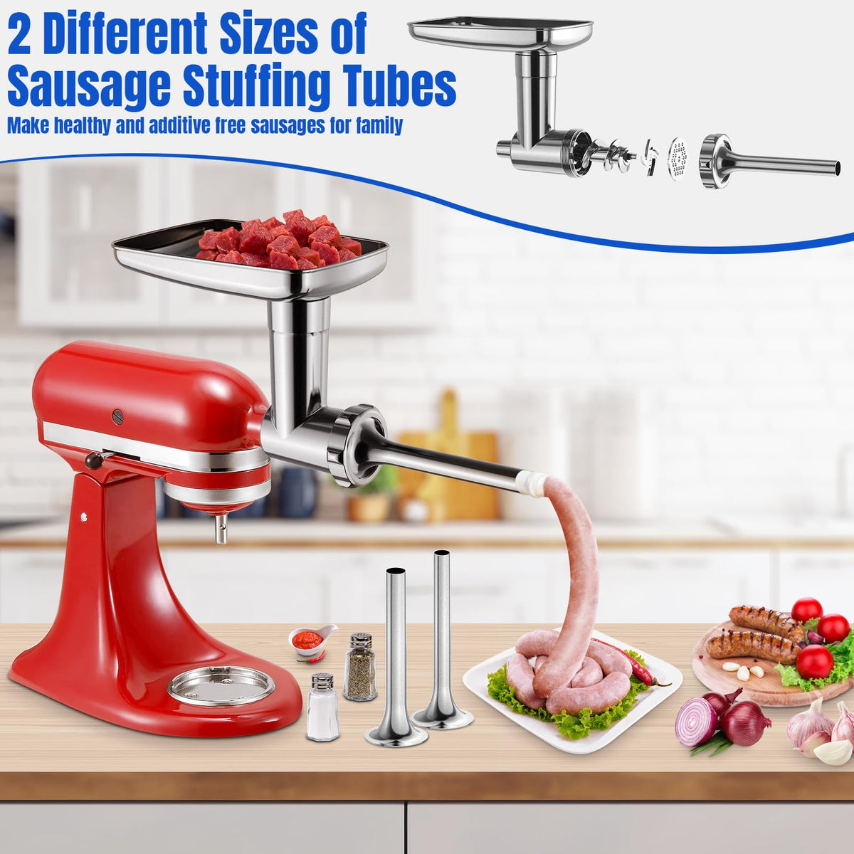 Q: Can I use the attachment for stuffing sausages, and how does that work?A: Yes, the stainless steel meat grinder attachment includes a sausage stuffing kit that makes it easy to create fresh sausage links. Simply secure the attachment, fill the casing with your prepared sausage mixture, and let your stand mixer do the work.