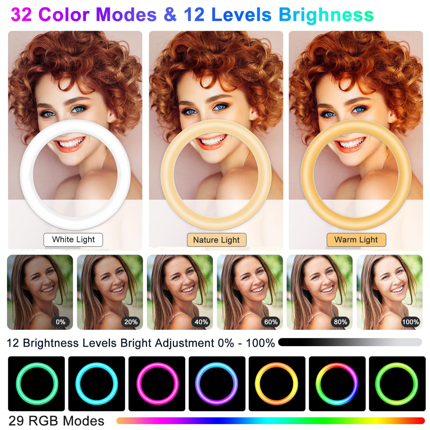 Stally 10.2'' Ring Light With Stand, 75'' Tall Ring Light With Phone Holder And Wireless Remote, 12 Dimming Levels, 32 Color Mod