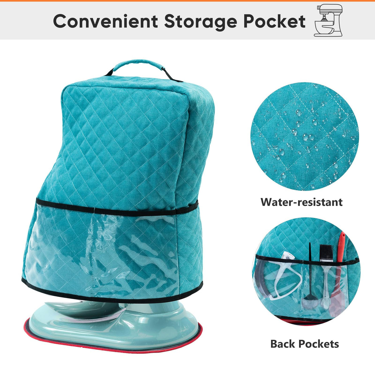 Q: What materials is the stand mixer cover made from?A: The stand mixer cover is made from high-quality, water-resistant quilted nylon. This material is durable and can be easily wiped clean with a damp cloth, providing excellent protection against dust and scratches.