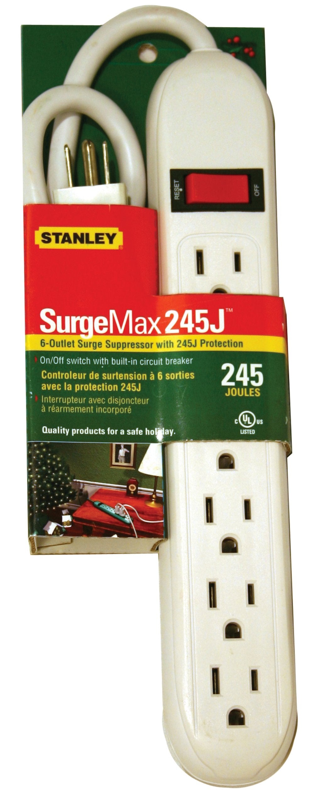 Six Outlet Surge Suppressor With 245 Joules Protection. On/Off Switch With Built-In Circuit Breaker. Ul Listed. Quality Products For A Safe Holiday. Rating: 125V 15A 1875W. Gauge: Awg 14/3 Sjt.