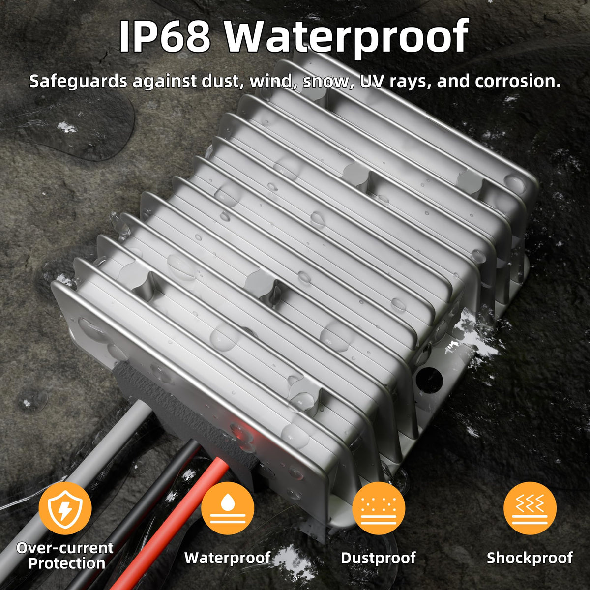 Q: Is this power adapter waterproof?A: Yes, the power adapter is designed with an IP68 waterproof rating, ensuring it can withstand harsh weather conditions such as rain, snow, and dust.